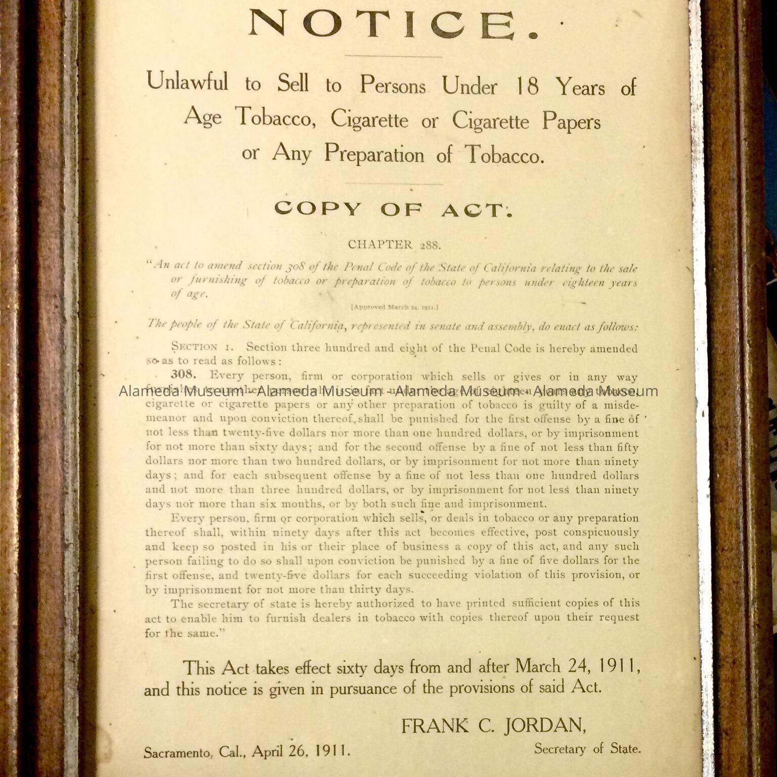 FRAMED NOTICE DECLARING IT UNLAWFUL TO SELL TOBACCO OR CIGARETTES TO MINORS. NOTICE WAS POSTED IN FRANK'S BARBER SHOP, 2055 LINCOLN AVENUE, ALAMEDA, CALIFORNIA.