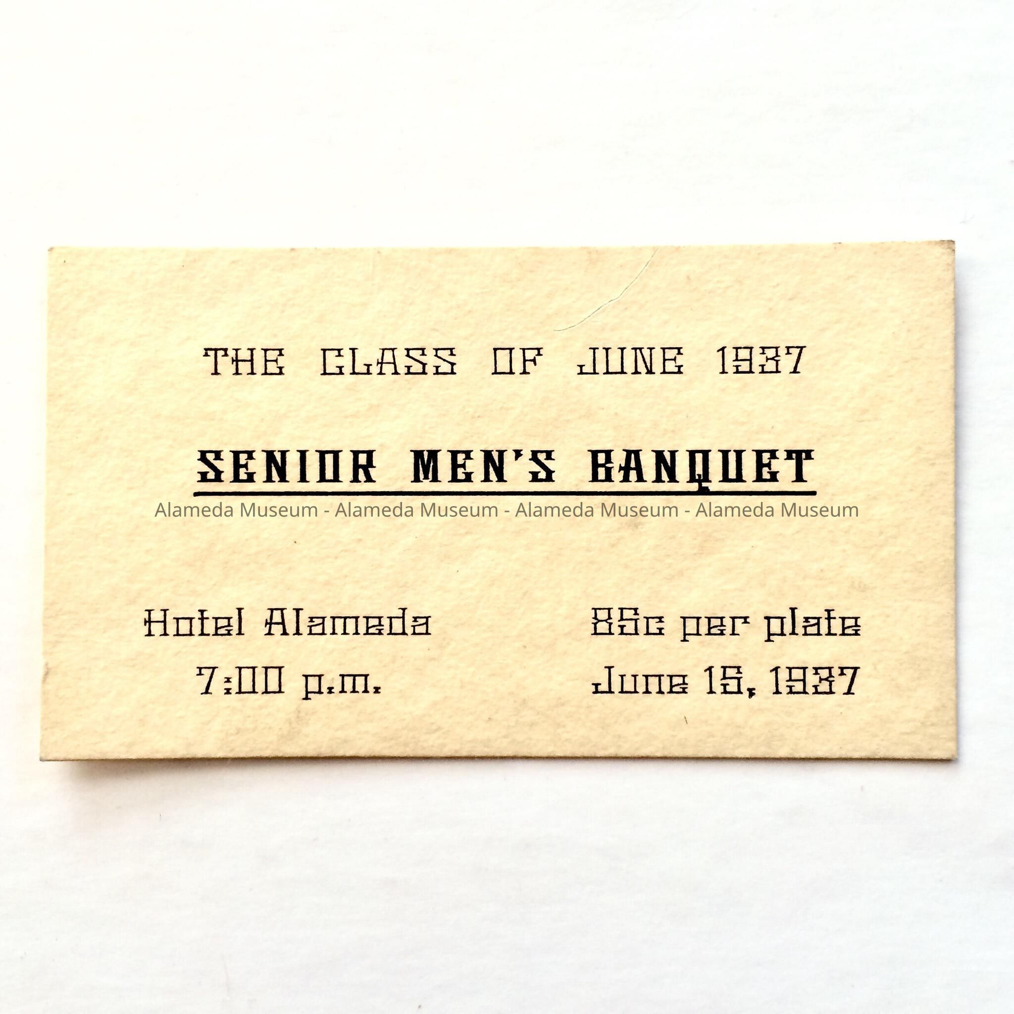 History of Object: Calling card stating "Senior Men's Banquet, The Class of June 1937, Hotel Alameda, 7:00 p.m., .85c per plate, June 15, 1937". This was the graduating class of the Alameda High School, 1937.