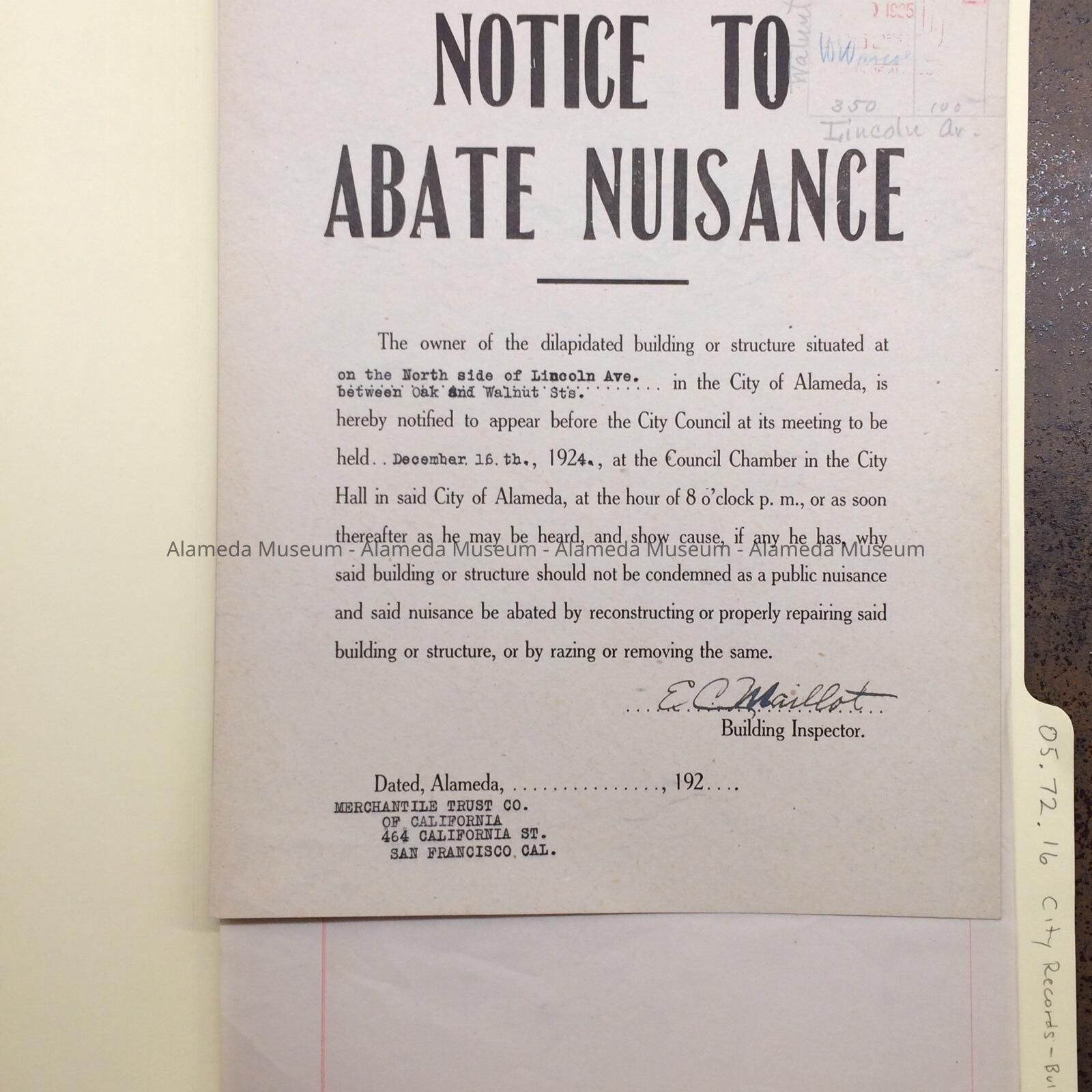 NOTICES OF ABATEMENT OF PROPERTY ON THE NORTH SIDE OF LINCOLN AVENUE BETWEEN OAK AND WALNUT STREETS. DOCUMENTS ARE SIGNED BY E C MAILLOT, BUILDING INSPECTOR.