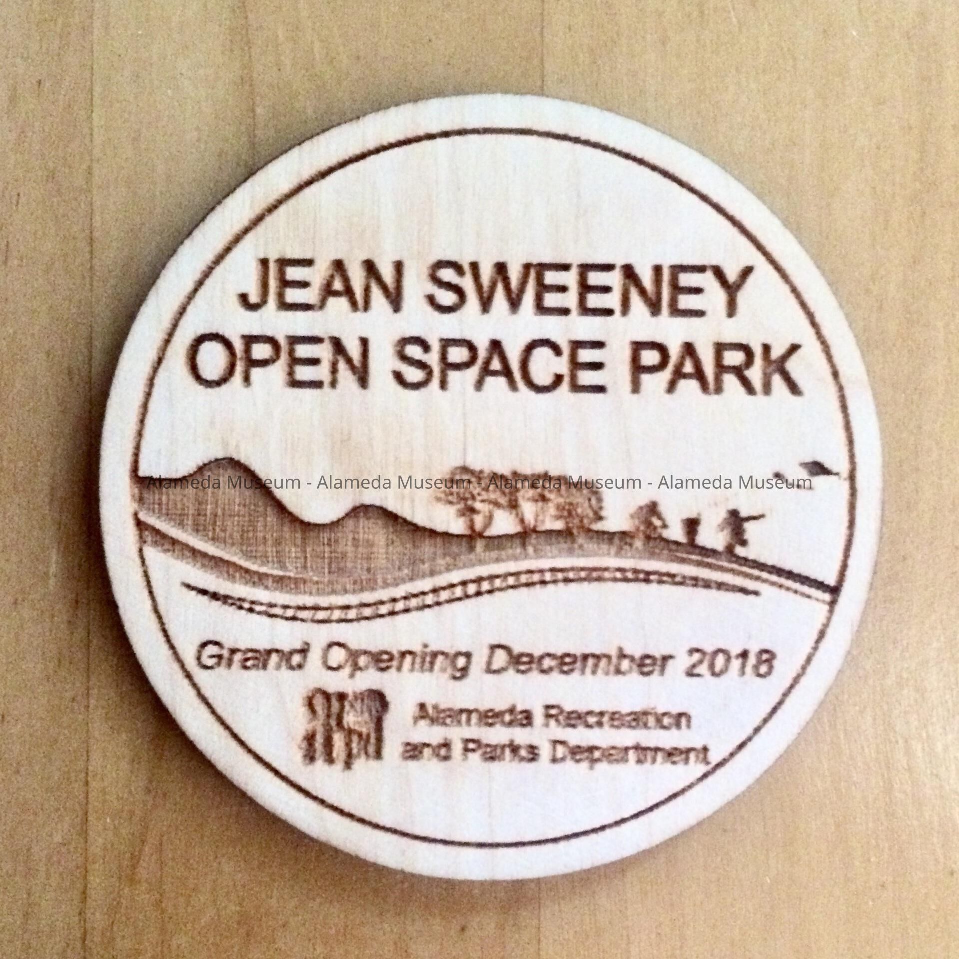 Description: A circular token with image of hillocks, trees orbushes, and a person flying a kite, with railroad tracks underneath, and the following words above: JEAN SWEENEY OPEN SPACE PARK. Below the image the words in italics: "Grand Opening December 2018", and below that, the words: Alameda Recreation and Parks Department, preceded by the organization's logo.