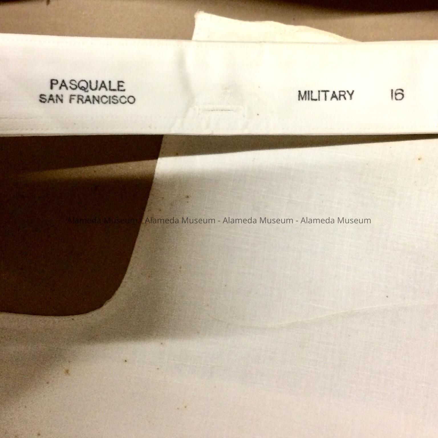 White linen detachable collar with three button-holes. Printed on the reverse "Pasquale, San Francisco, Military 16."