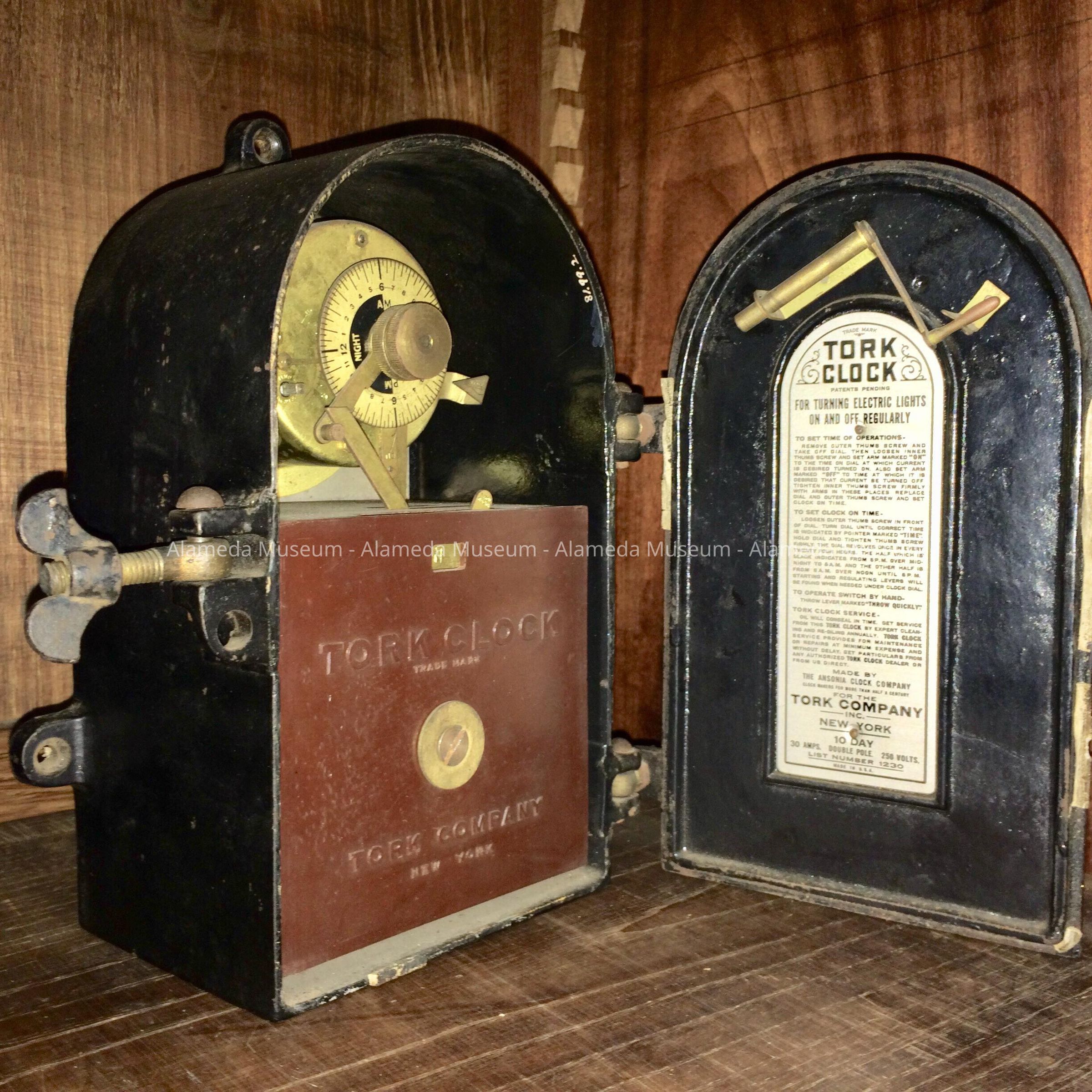 History of Object: This Tork Clock was used for turning the electric lights on and off in the first nickelodeon in Alameda. It was owned and operated by Mr. Edmund Heritage at 2308 Santa Clara Avenue in 1911.