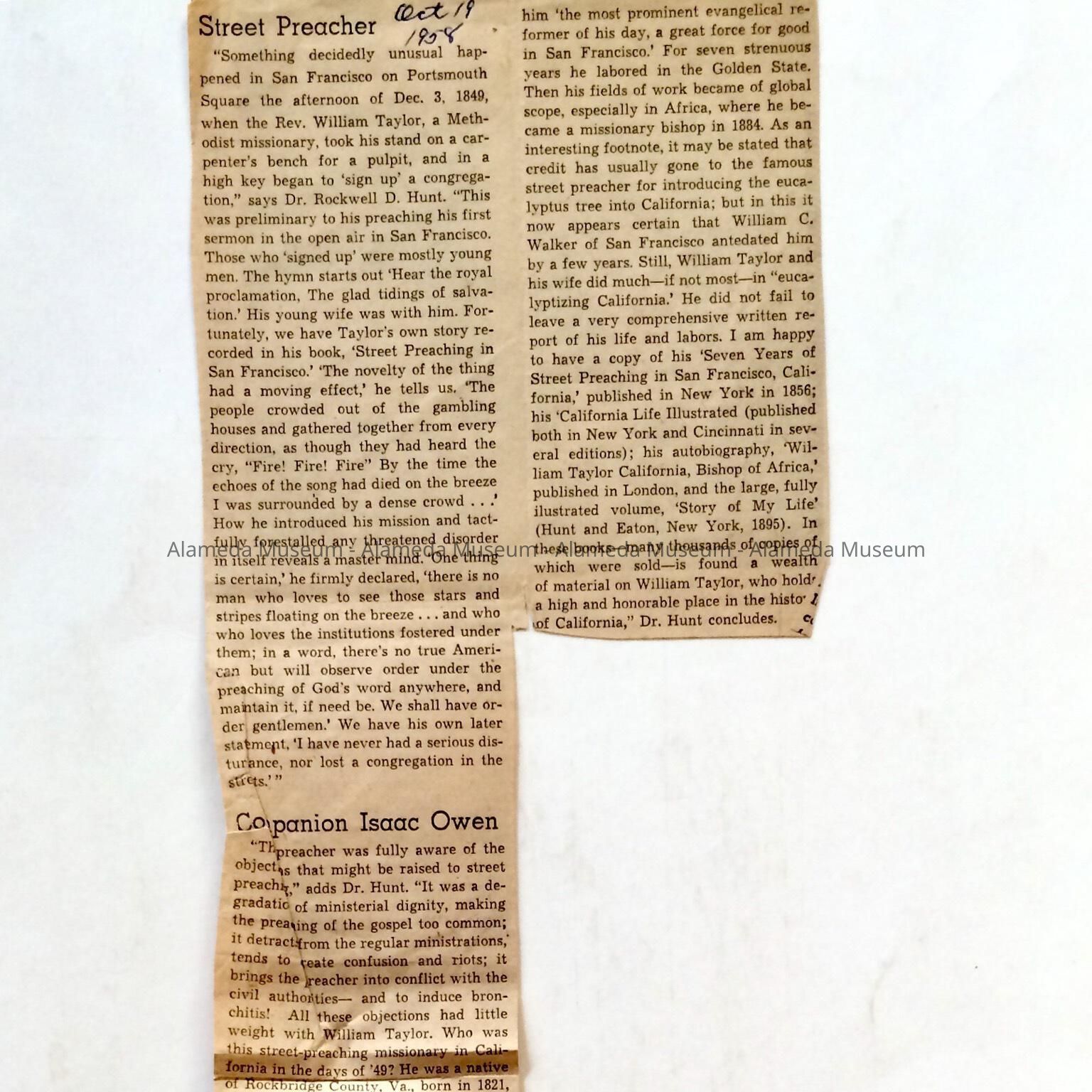 NEWSPAPER CLIPPING CUT FROM THE OCTOBER 1958 HISTORY SECTION OF THE "OAKLAND TRIBUNE." CLIPPING IS WRITTEN ABOUT THE CAREER OF REVEREND WILLIAM TAYLOR, WHO PREACHED ON THE STREETS OF SAN FRANCISCO DURING THE GOLD RUSH PERIOD. ALSO MENTIONED ARE EUCALYPTUS TREES THAT REVEREND TAYLOR ADVOCATED FOR CULTIVATION IN CALIFORNIA. TAYLOR AND ISABELLE, WIFE, WERE PROMINENT LANDOWNERS IN THE CITY OF ALAMEDA AND THE PARENTS OF OUR FIRST MAYOR, E K TAYLOR. CLIPPING WAS GIVEN TO THE ALAMEDA HISTORICAL SOCIETY PRIOR TO 1971 AND NOT OFFICIALLY CATALOGED AT THAT TIME.