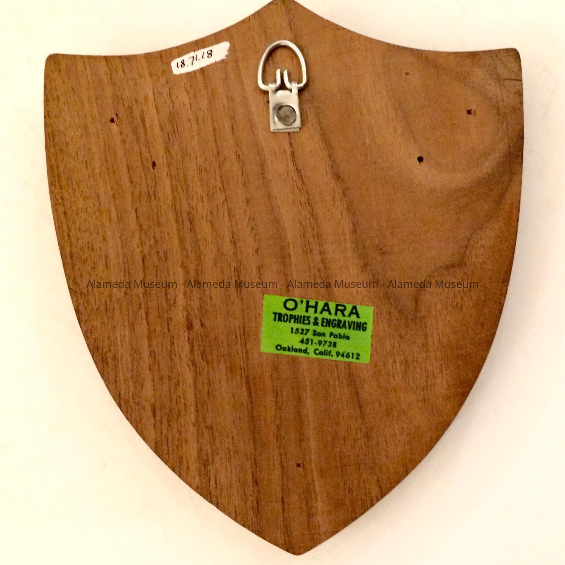 Description: A shield-shaped walnut mounting with an attached brass plaque that is engraved "L. F. Stone, Life Member 1974, Oakland Yacht Club''. Attached to it is a flag-shaped white and blue colored flag with the letter "O".