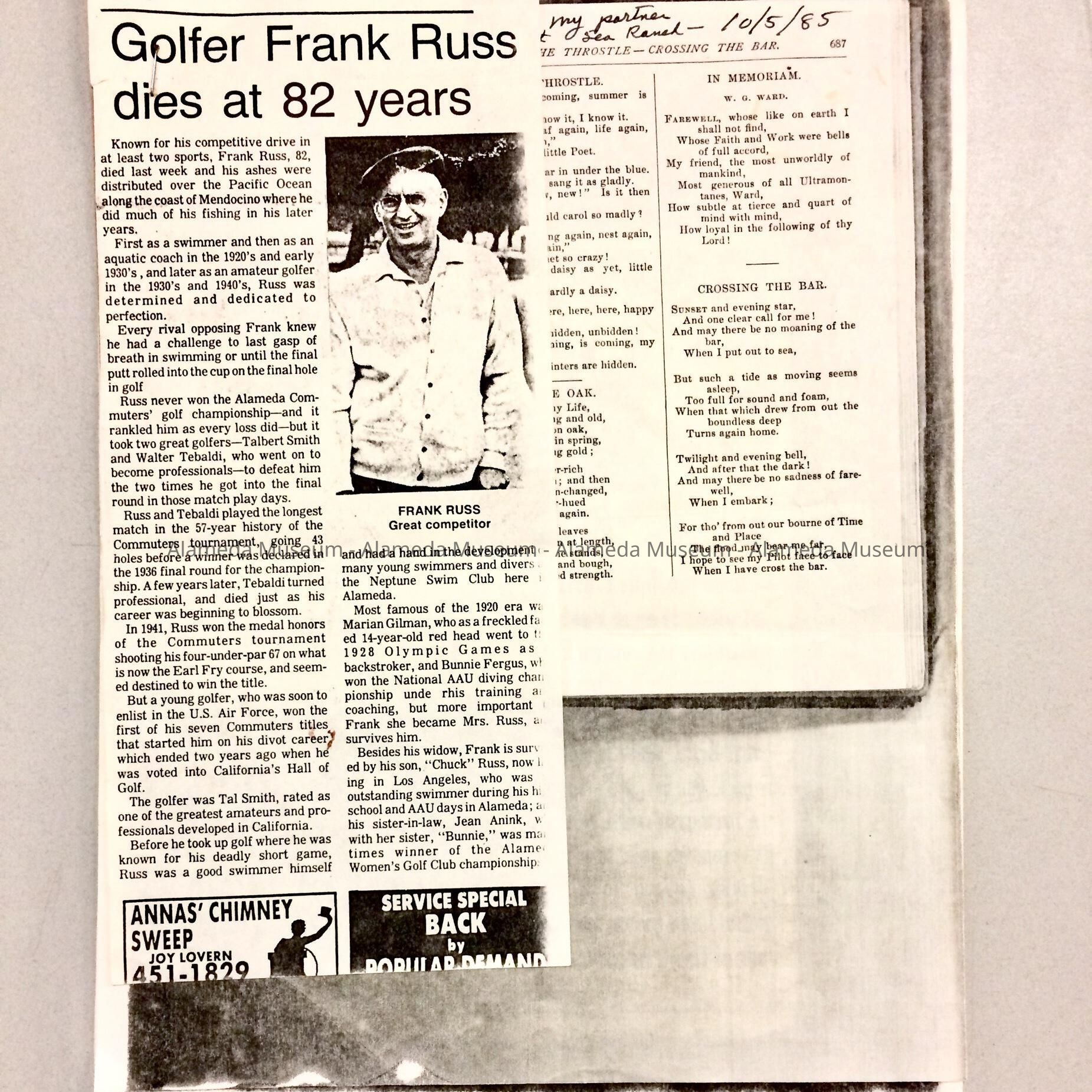 Obituary for golfer Frank Russ, husband of Bunny Fergus, 1985Entry/Object ID
