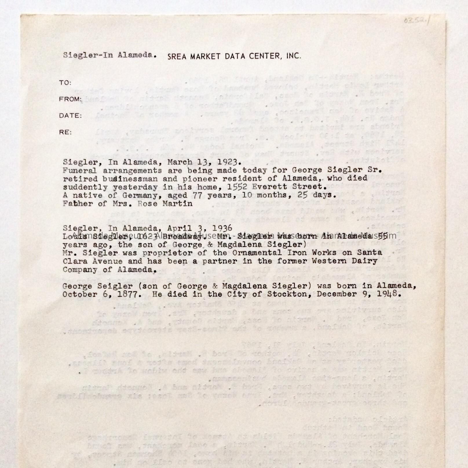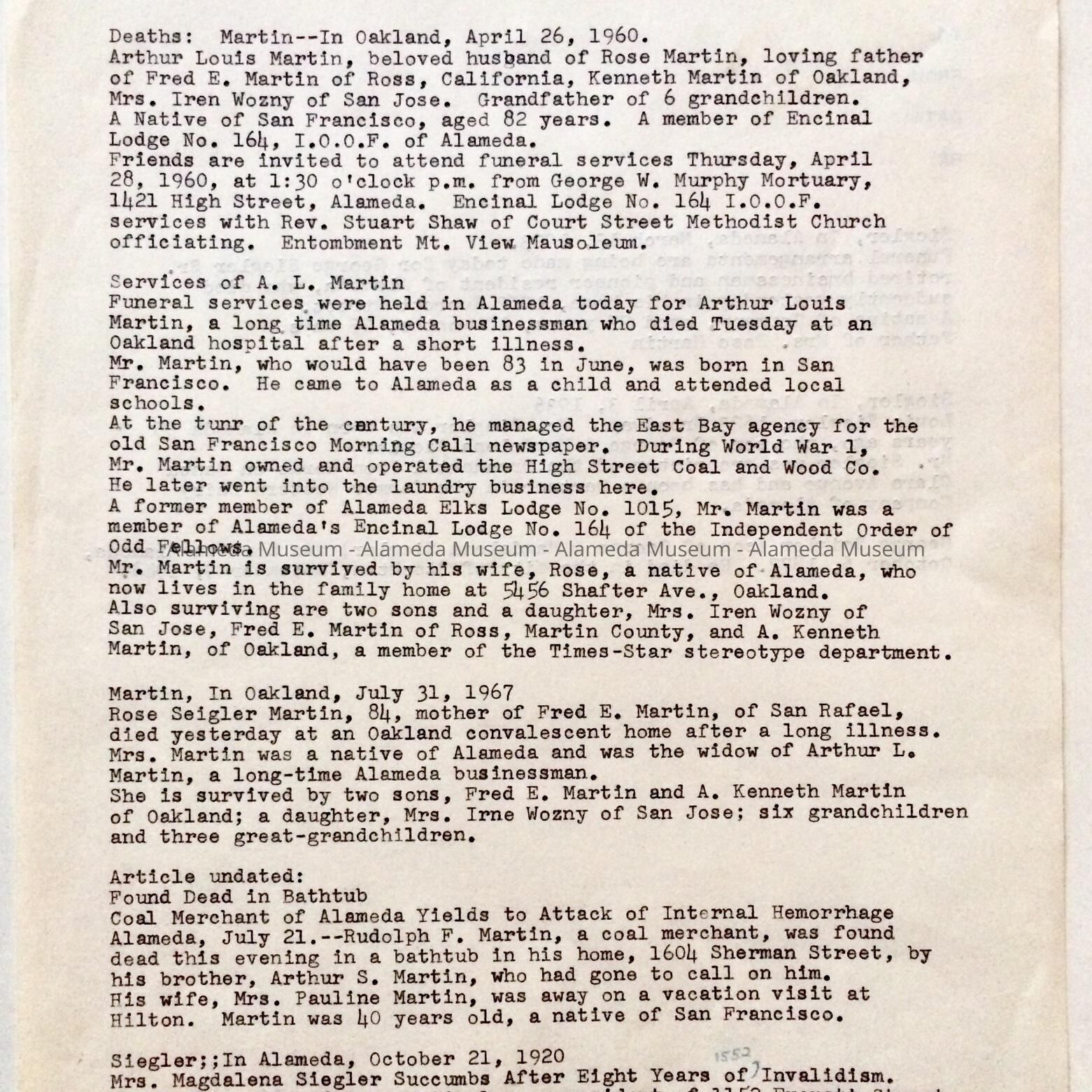 BIOGRAPHICAL INFORMATION ON ARTHUR LOUIS MARTIN, ROSE SEIGLER MARTIN, RUDOLPH F MARTIN, MAGDALENA SEIGLER, GEORGE SEIGLER, LOUIS SEIGLER, WHO WERE FAMILY MEMBERS AND EARLY RESIDENTS OF ALAMEDA.
