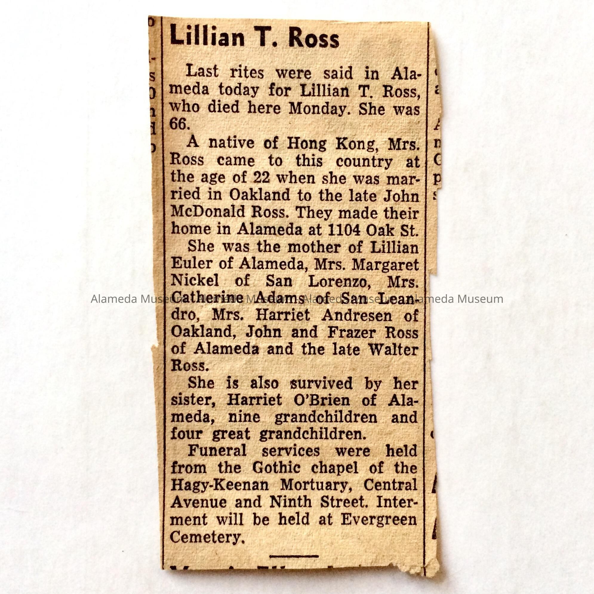 OBITUARY NOTICE OF LILLIAN T ROSS. LILLIAN WAS THE WIFE OF THE LATE JOHN MC DONALD, 1104 OAK STREET, ALAMEDA.