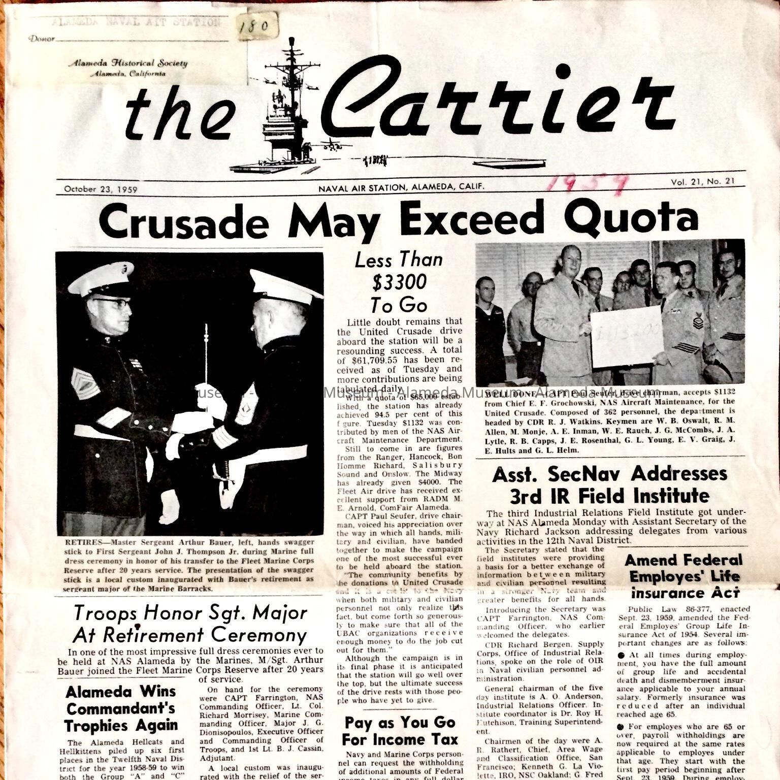 History: October 23, 1959 edition of The Carrier published by the US NAS Alameda. It has illustrations and articles concerning personnel and events at the Naval Air Station.