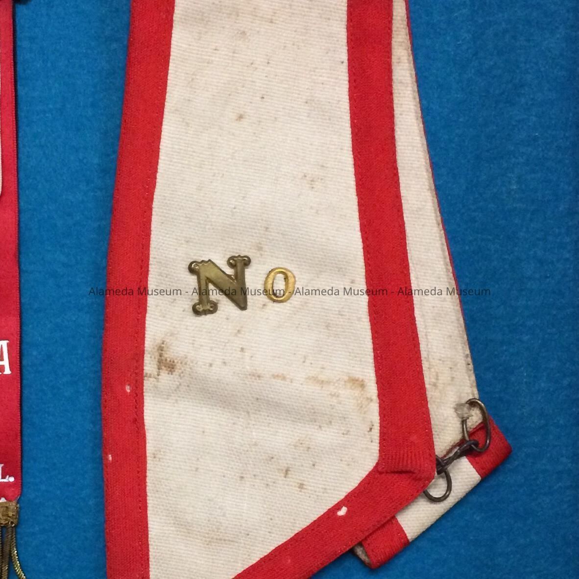 Heavy linen trimmed with red wool material. On the right it says "40" in brass letters. On the opposite side it says No. meaning the lodge number. The inside has stamp that says "J.M.Litchfield, and Company. 12 Post Street, San Francisco".
