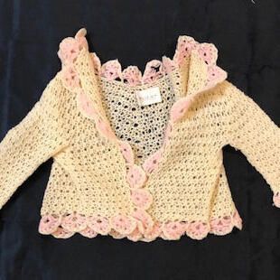 Description: Wool off-white colored and crocheted long sleeve baby jacket with pale pink crocheted colored edging.
