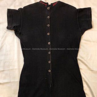 History of Object: Official rental bathing suit (circa-1920), Sunny Cove Beach, 456 Central Avenue, Alameda, Ca. George H. & Bertha Masters, owners and proprietors. Now the present site of Paden School.