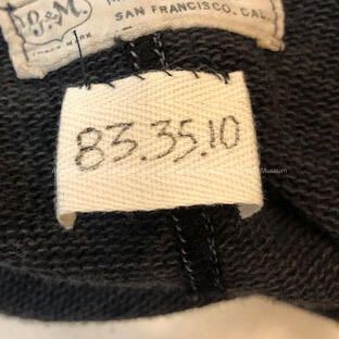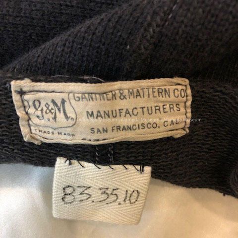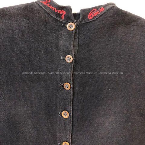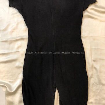 Description: Black colored heavy cotton one piece bathing suit (full length to knees), eight buttons from collar to navel. Red embroidered letters (in script) on collar state "Sunny Cove" White printed clothing label states "G. & M" (in shield) Trade Mark, Gantner & Mattern Co., Manufacturers, San Francisco, Cal. 46".