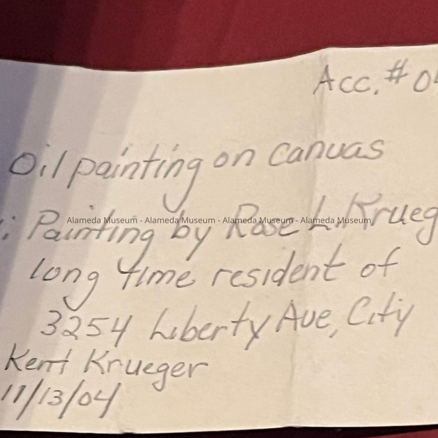 HISTORY OF OBJECT: PAINTING CREATED BY THE LATE ROSE L. KRUEGER, LONG-TIME RESIDENT OF 3254 LIBERTY AVENUE, ALAMEDA, AND GRANDMOTHER OF THE DONOR.