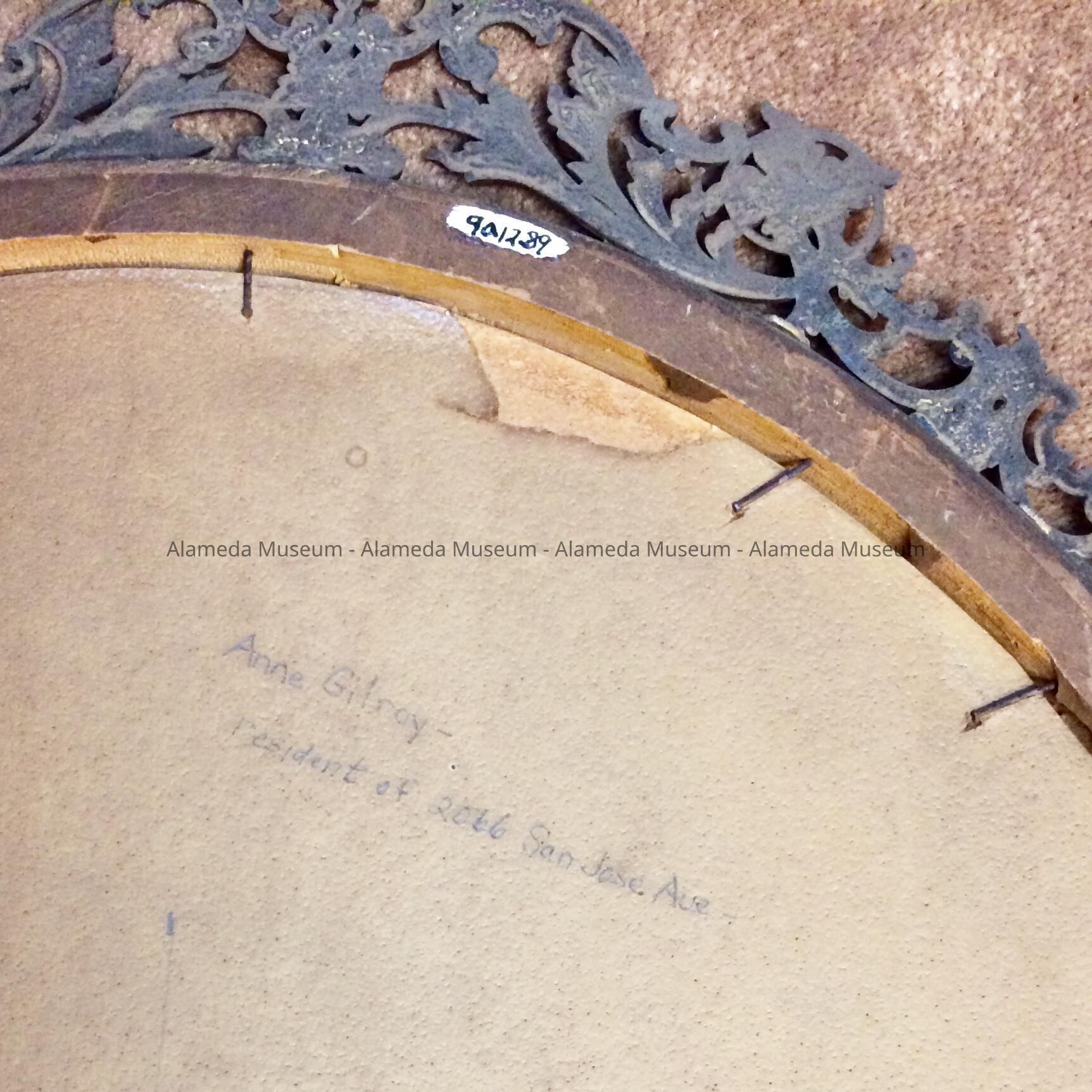 PORTRAIT OF ANNE GILROY (DIED SEPTEMBER 13, 1915 AND BURIED AT SAINT MARY'S CEMETERY, OAKLAND). SHE WAS THE MOTHER OF MAUDE GILROY MACDONALD (DIED MAY 17, 1911) AND MOTHER-IN-LAW OF NEIL MacDONALD (DIED APRIL 20, 1943), AND GRANDMOTHER OF ANNE M. MacDONALD. MRS. GILROY WAS A RESIDENT OF ALAMEDA AND LIVED WITH HER DAUGHTER, SON-IN-LAW, AND GRANDDAUGHTER AT 2066 SAN JOSE AVENUE, ALAMEDA. THE PORTRAIT (CIRCA 1860) WAS MOST LIKELY REFRAMED IN THE LATE 1890'S.