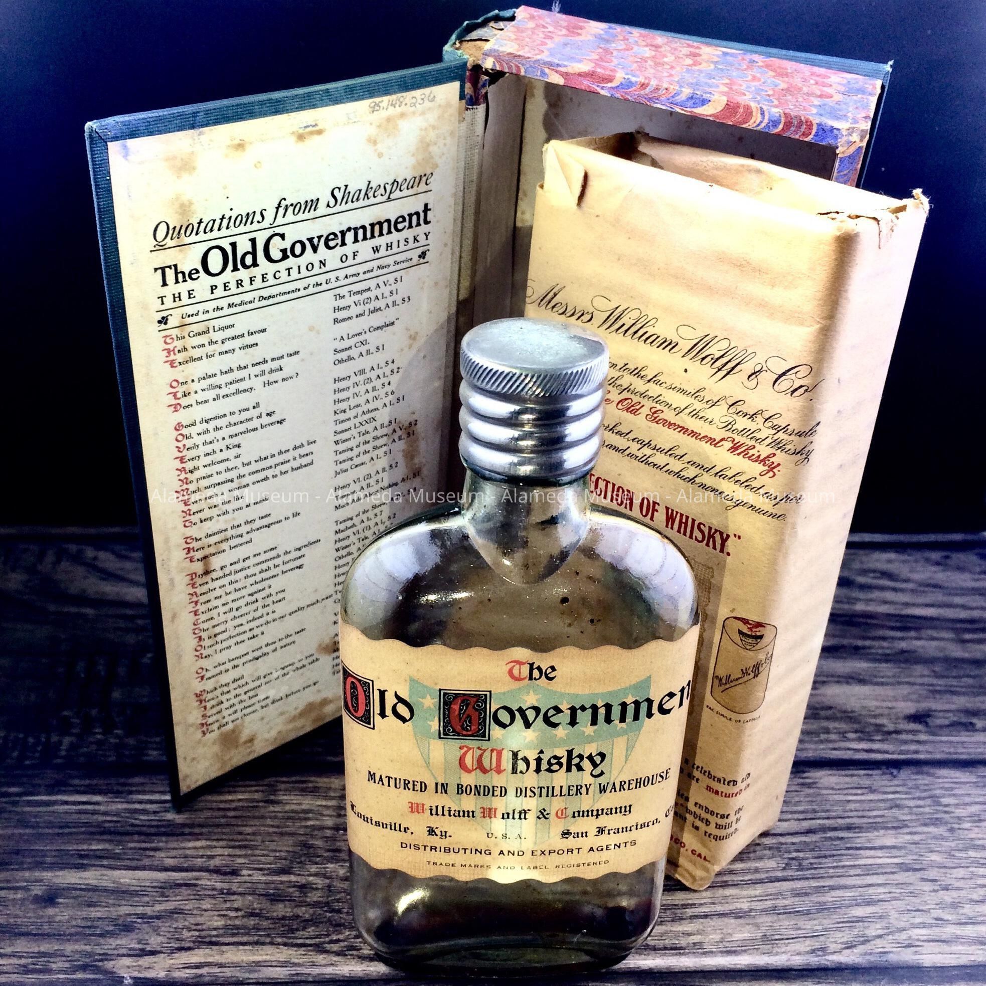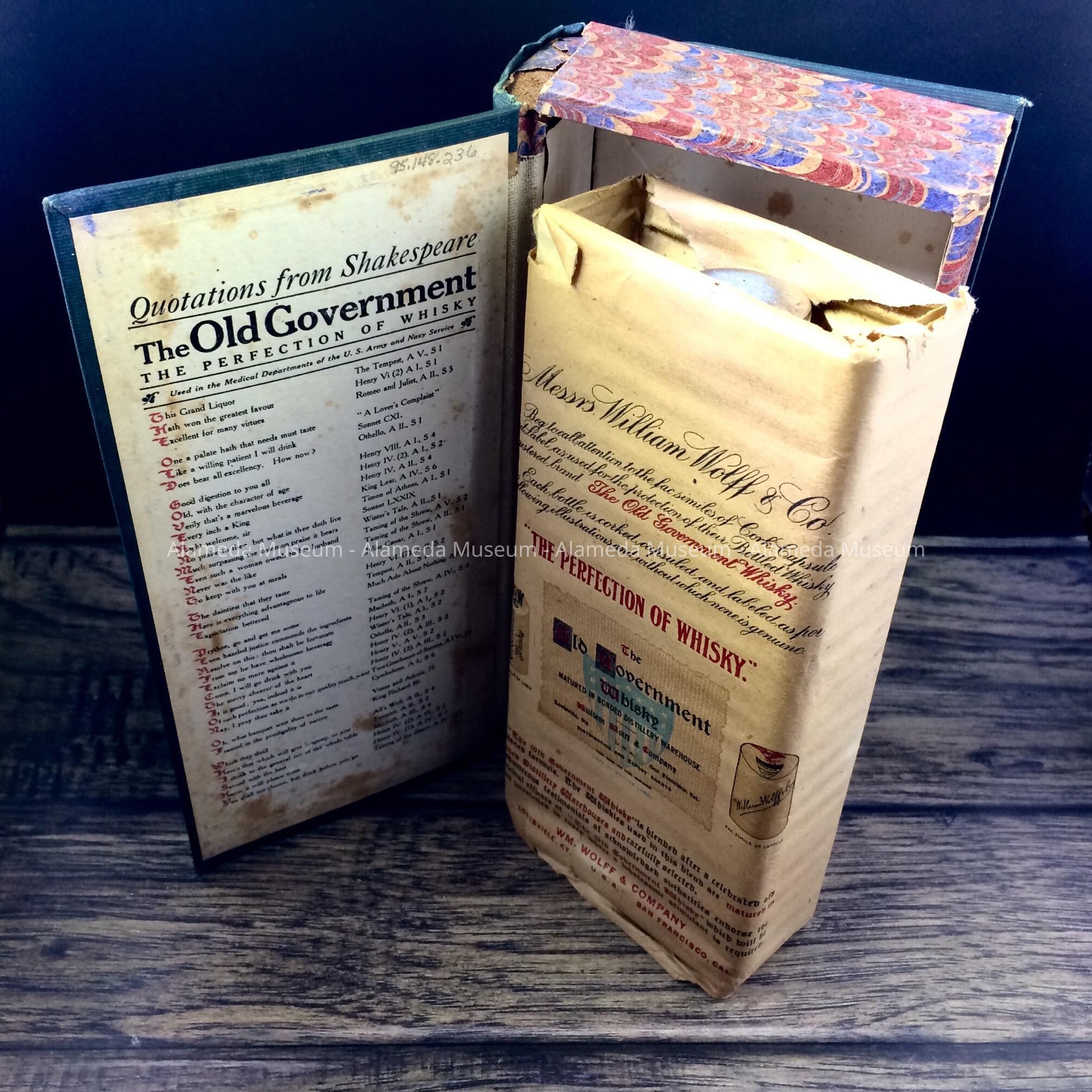 FLAT-SIDED, DOUBLE-SEAM, PALE AQUA-COLORED GLASS FLASK, WITH METAL SCREW TOP. ORIGINAL LITHOGRAPHIC PAPER LABEL STATES, "THE OLD GOVERNMENT WHISKY." THIS, IN TURN, IS HOUSED IN A CARDBOARD RECEPTACLE, WITH A PAPER LABEL IN BLACK-, BLUE-, AND RED-COLORED TYPE. BOLD-PRINTED CAPTION STATES, "THE PERFECTION OF WHISKY." THE BOX IS CAMOUFLAGED AS A HARD-BOUND BOOK, COVER OF WHICH IS IN A DARK GREEN-COLORED BUCKRAM. CAPTION ON SPINE IN GOLD-COLORED INCISED LETTERING STATES, "QUOTATIONS FROM SHAKESPEARE. CHOICE SELECTION."