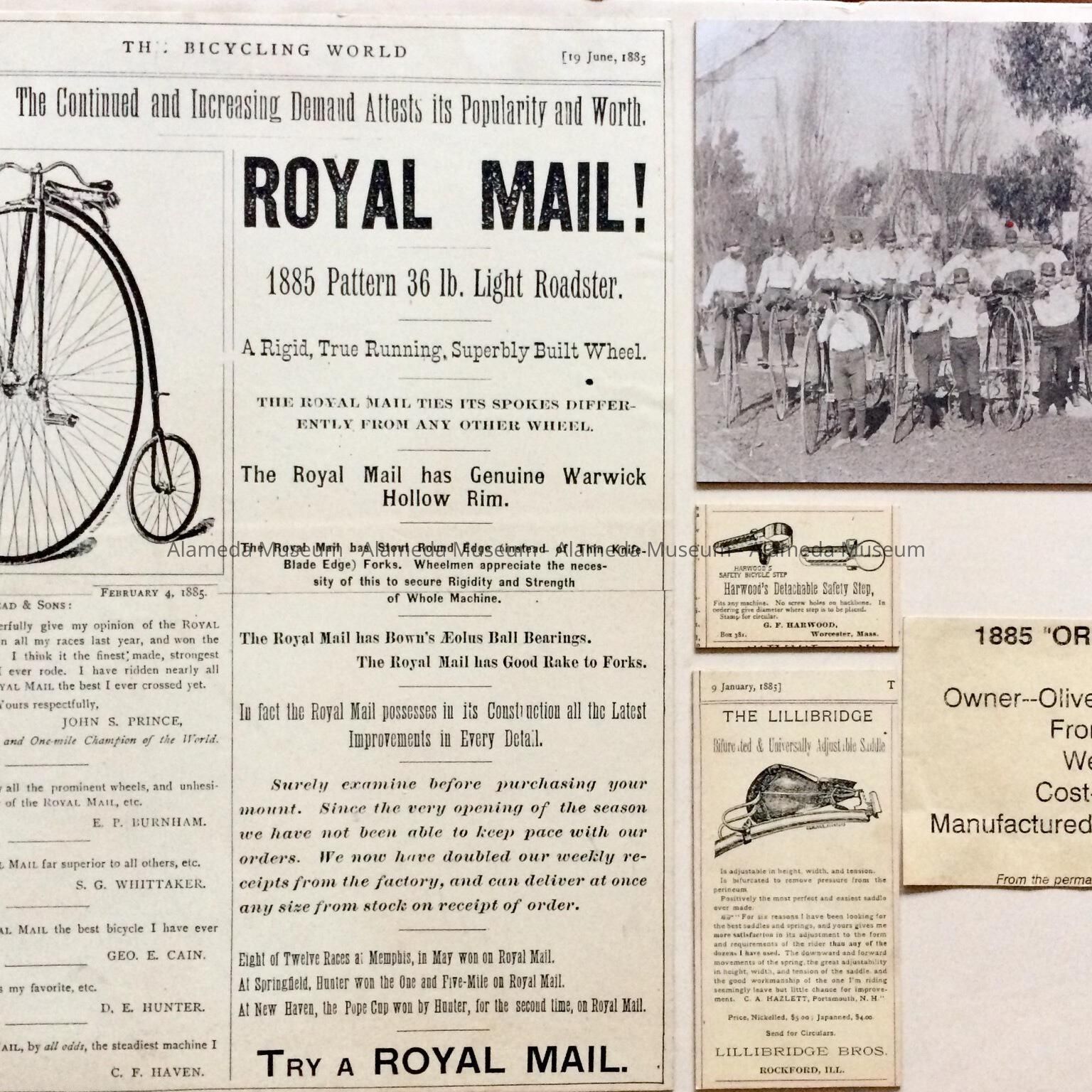 The handle bars and the brake were originally nickel plated. It has ivory grip handles and leather covered seat. The foot pedals are white rubber. The brass name shield name plate affixed with two screws to the main support shaft, which states "Royal Mail", Read & Son, Boston, (This was an American Distributor for the English Company).