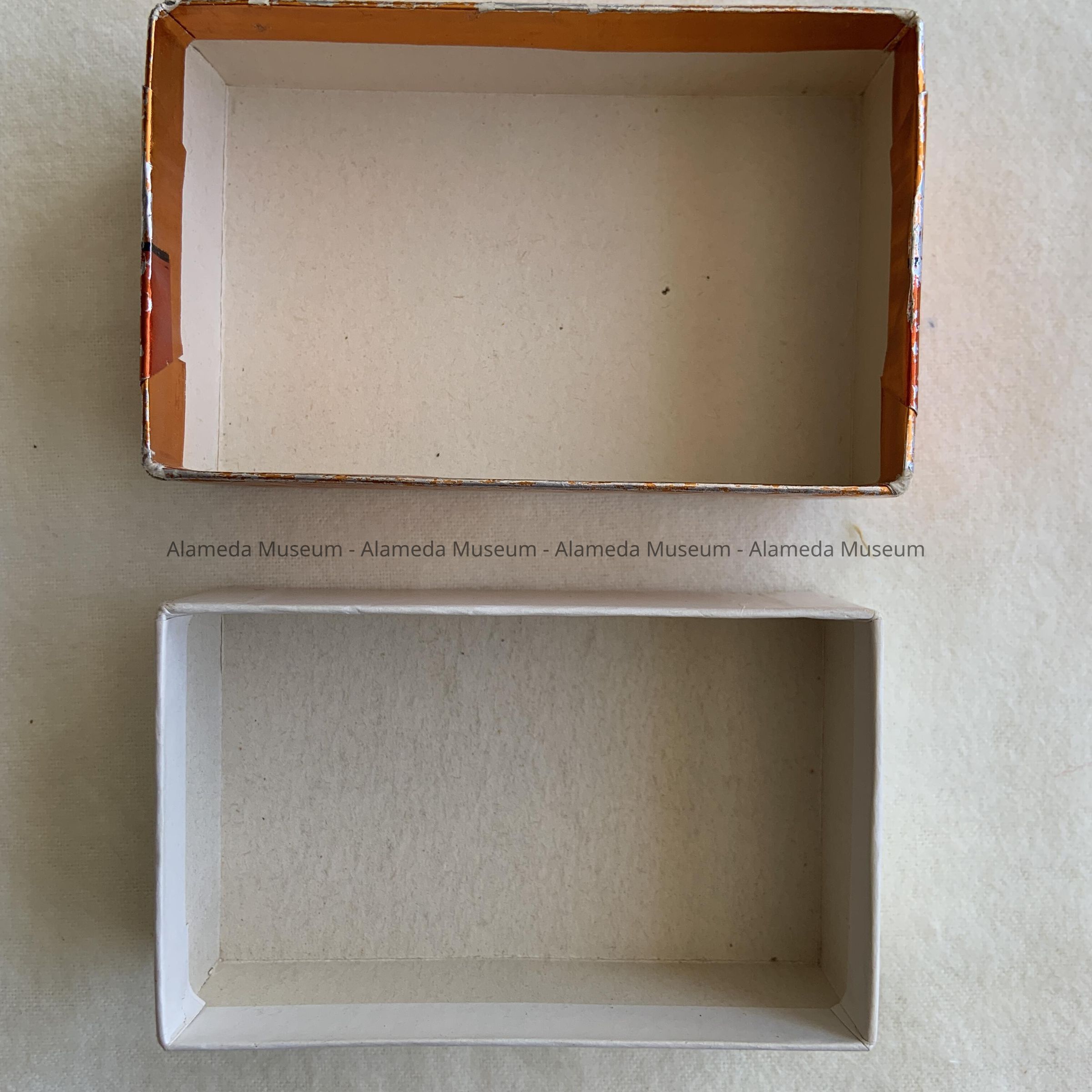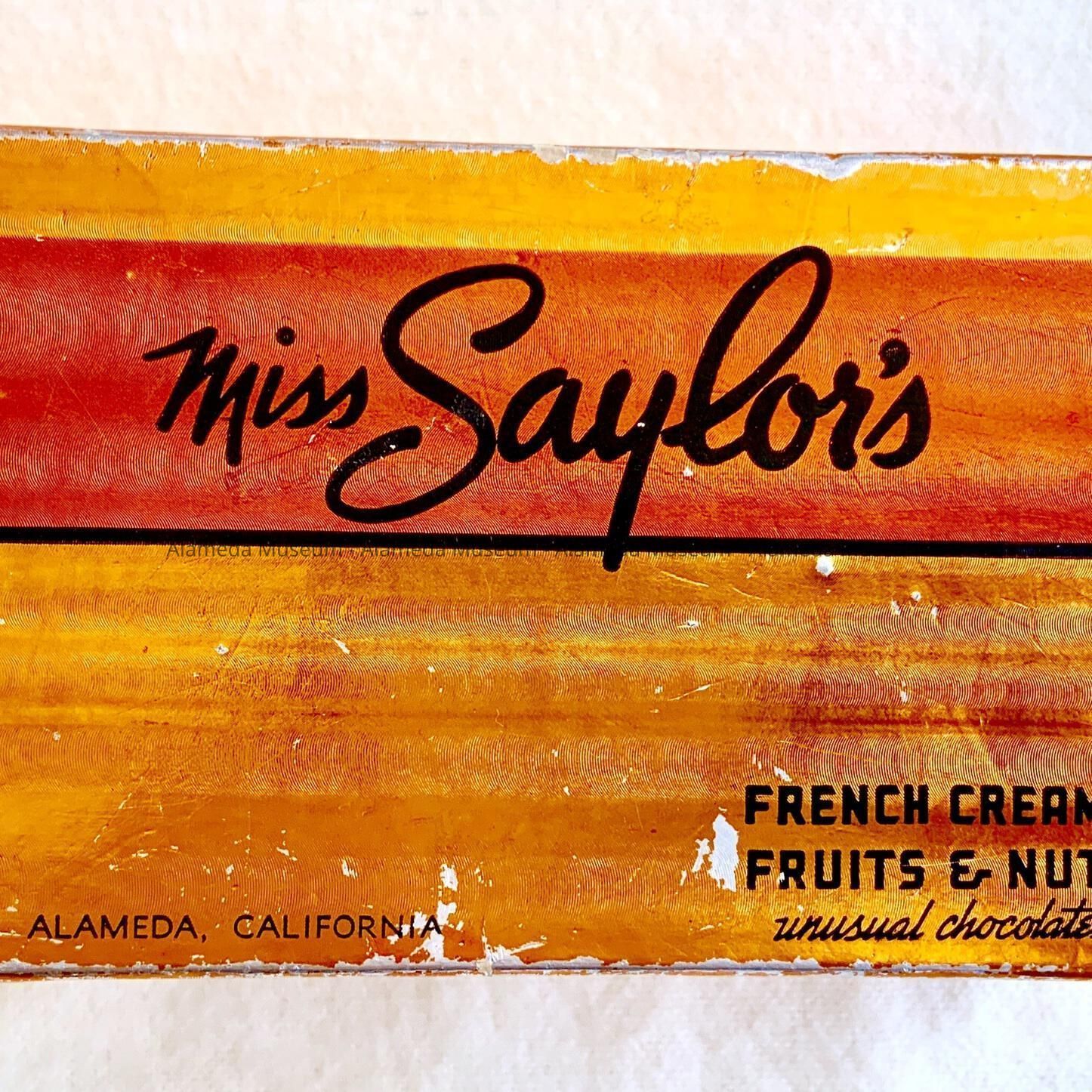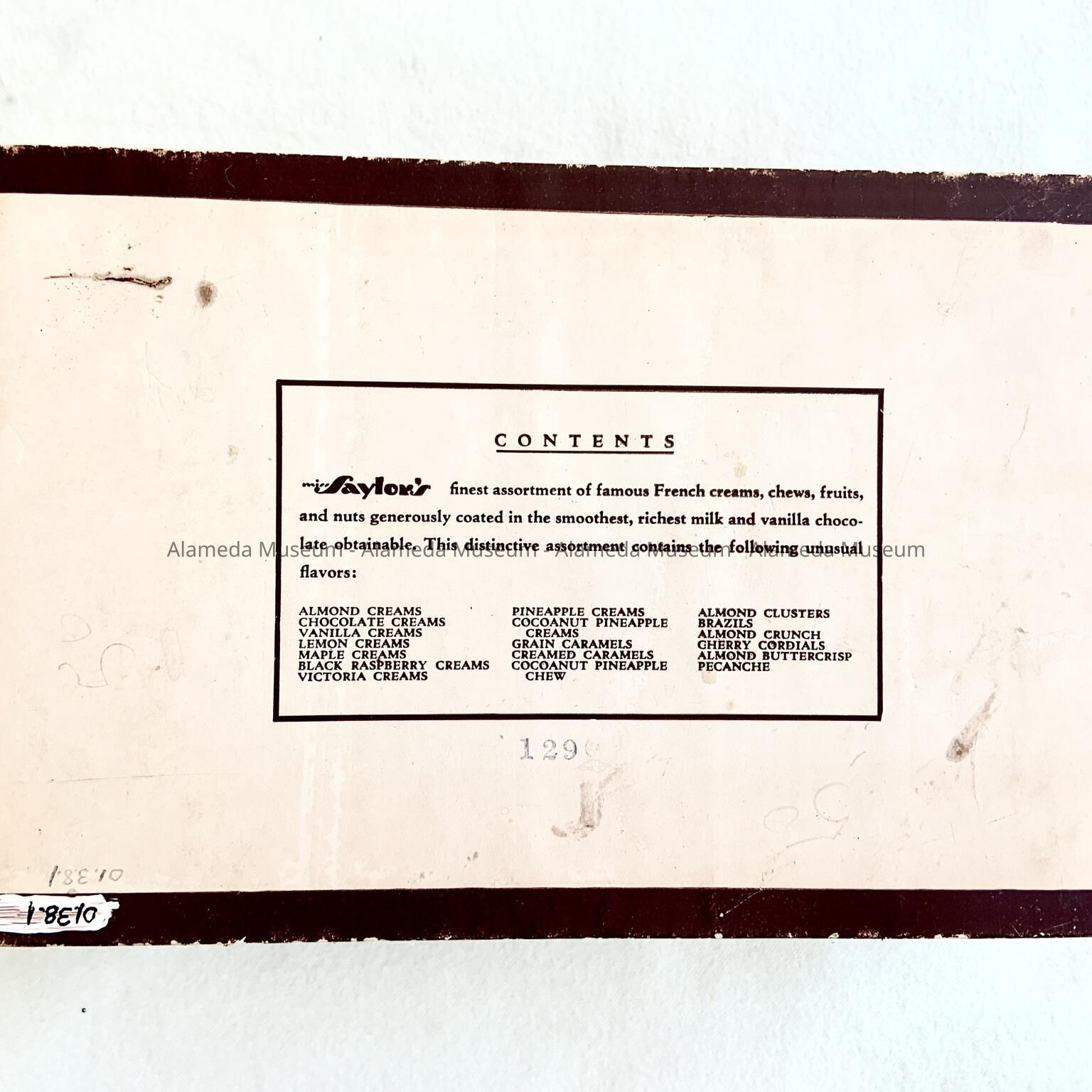 CANDY BOX FROM MISS SAYLOR'S (CANDY ESTABLISHMENT). BOX ORIGINALLY CONTAINED FRENCH CREAMS, FRUIT AND NUTS, ETC. THE BOX LID STATES, "ALAMEDA, CALIFORNIA." THE CANDY COMPANY WAS LOCATED AT THE SOUTHEAST CORNER OF ENCINAL AVENUE AND PARK STREET.
