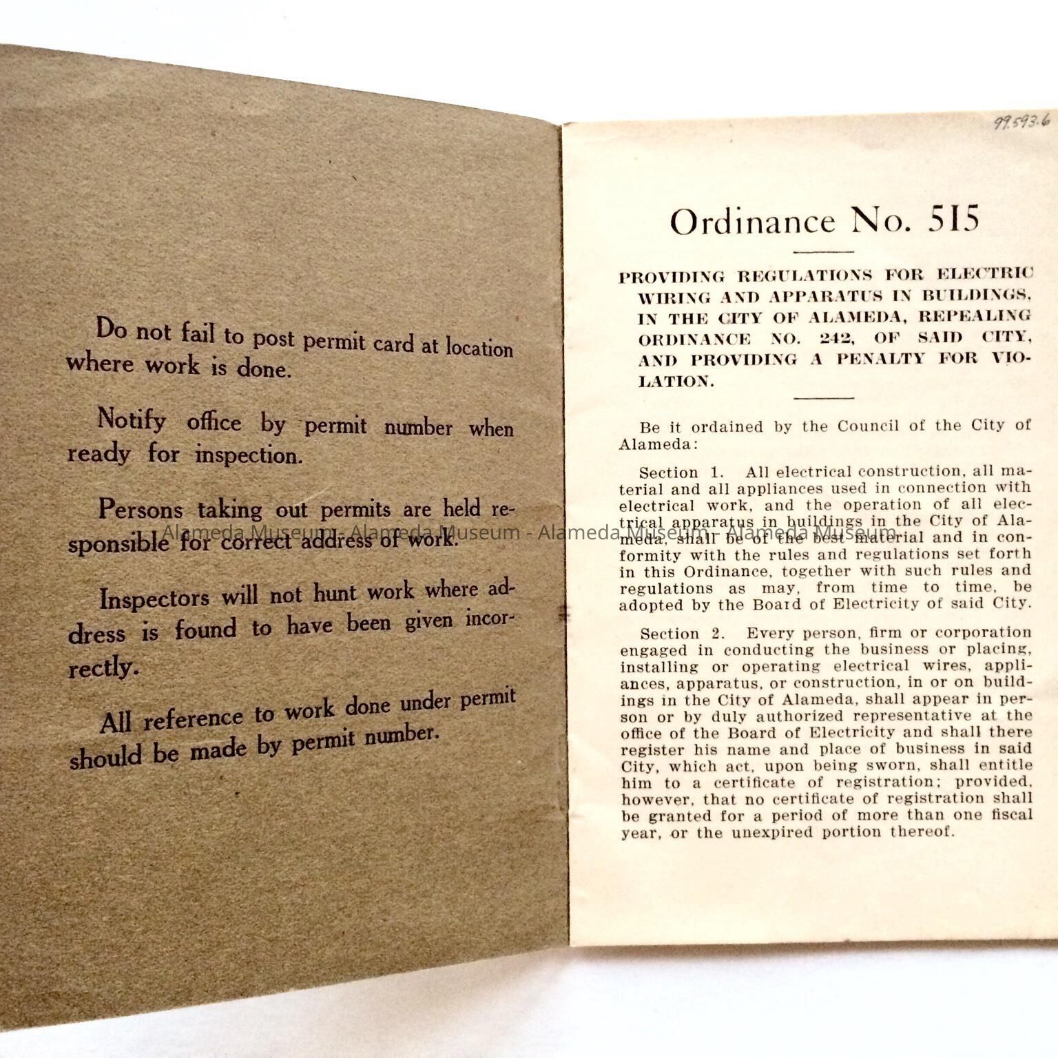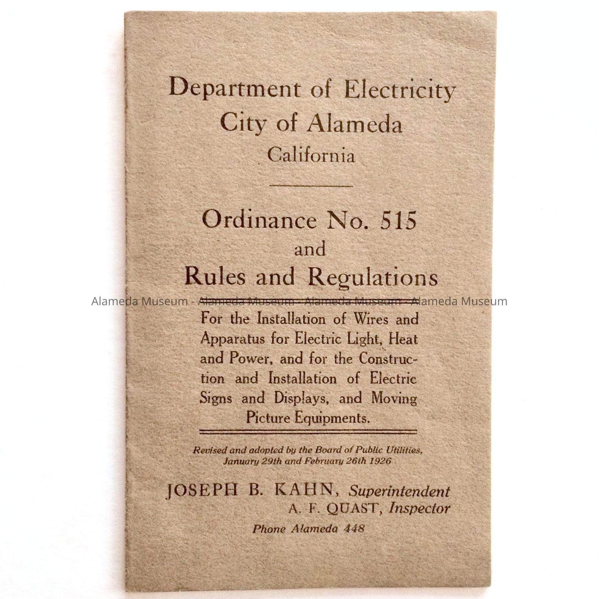History: Booklet contains Ordinance #515 and Rules and Regulations for the installation of electrical equipment in buildings issued by the Department of Electricity, City of Alameda.