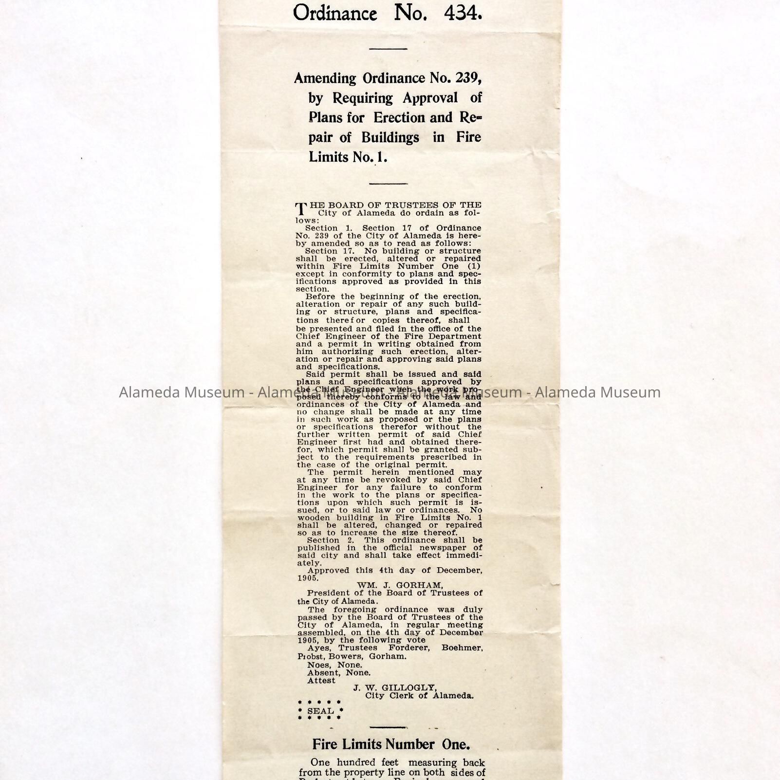 History of Object: Printed ordinance issued by the City Hall, No 434., amending Ordinance No. 239, by requiring approval of plans for erection and repair of buildings in Fire Limits No. 1. (both sides of Park Street, between Encinal Avenue and Lincoln Avenue).