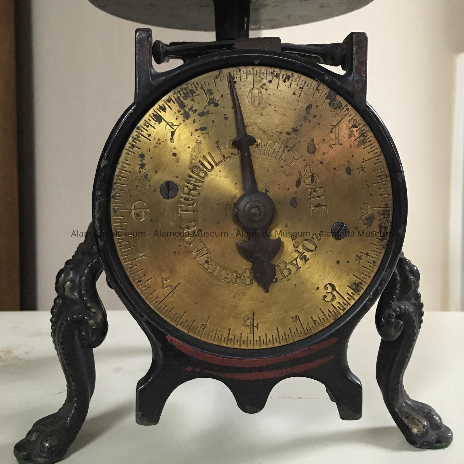 THE FOLLOWING INFORMATION WAS ATTACHED TO THE SCALE: "THIS OLD TURNBULL FAMILY SCALE WAS FOUND IN THE OLD HOME OF DR. GL SCHMIDT, 1059 SANTA CLARA AVENUE. HE LIVED THERE FOR MANY YEARS AND PRACTICED DENTISTRY AT 1115 BROADWAY, OAKLAND. DONATED TO THE ALAMEDA HISTORICAL SOCIETY BY MRS JUNE P OLIVERI."