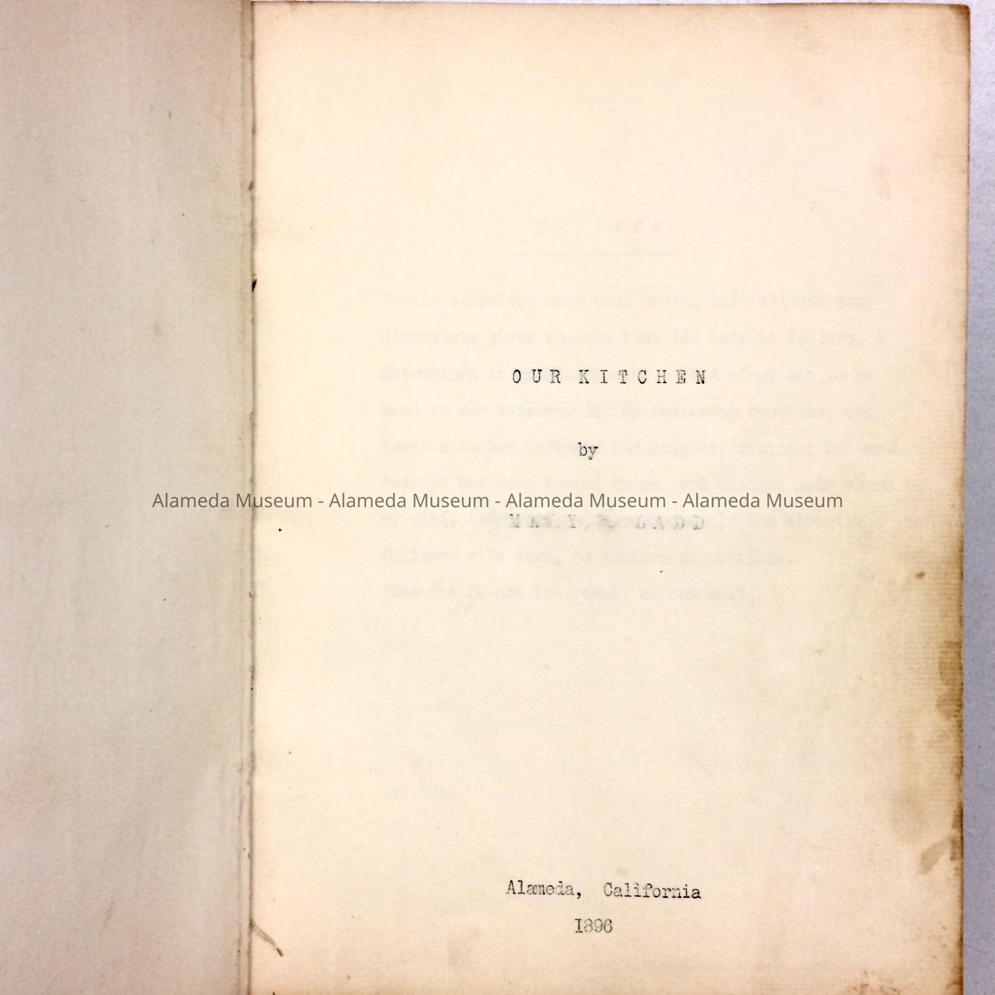 History of Object: Recipe book written and compiled by Mary E. Ladd, a resident of Alameda. The book also appears to have been printed here.
