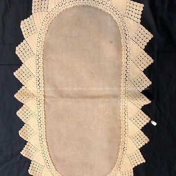 Oval shaped doily or runner of unbleached linen with hand crocheted ecru colored lace edging.