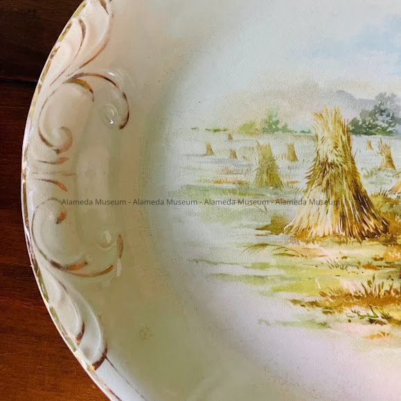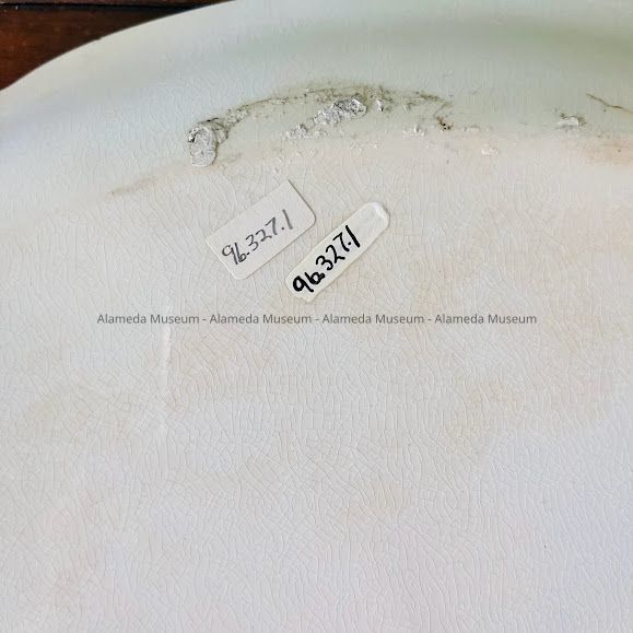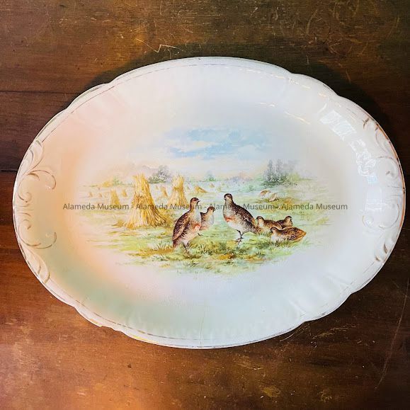 PLATTER THAT BELONGED TO RODNEY AND HIS SISTER, ALICE O'HARE. THEY WERE LONGTIME RESIDENTS AT 1808 PEARL STREET, ALAMEDA. THE PLATTER COMPRISES PERSONAL PROPERTY THAT WAS BROUGHT TO THE HOUSE IN 1923. THEY WERE ORIGINAL OWNERS OF THE HOUSE. MR O'HARE WORKED FOR THE LOOP LUMBER COMPANY, FOOT OF BROADWAY. THE DONOR IS THE DAUGHTER OF RODNEY, AND NIECE OF ALICE O'HARE.
