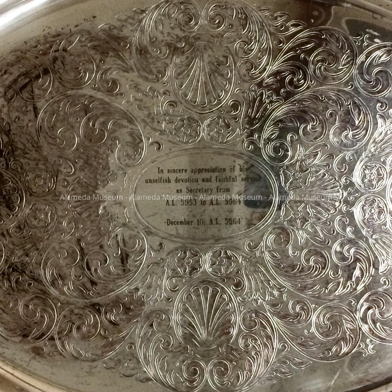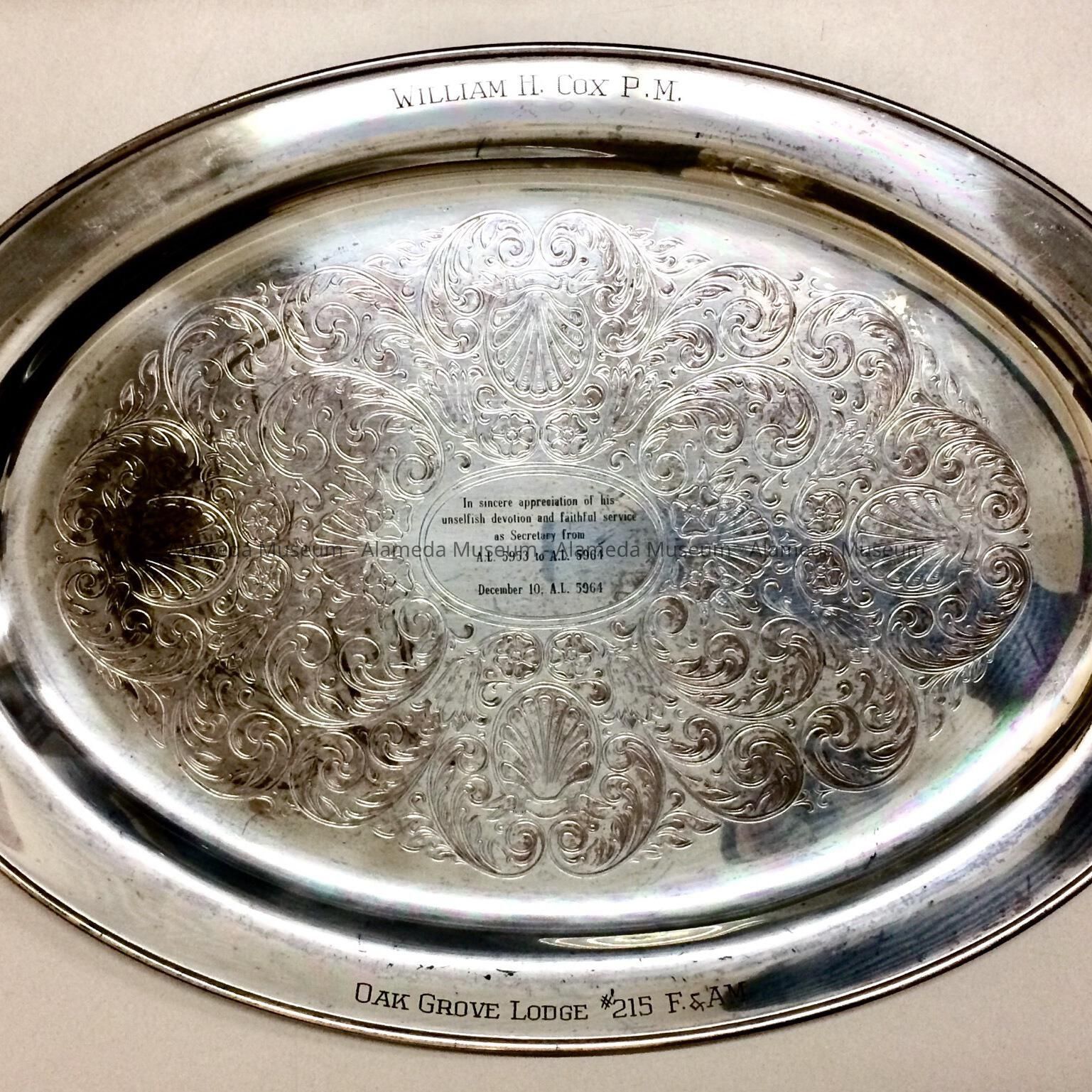 History of Object: Tray presented to William H. Cox from his Masonic Lodge, Oak Grove, Alameda, California.