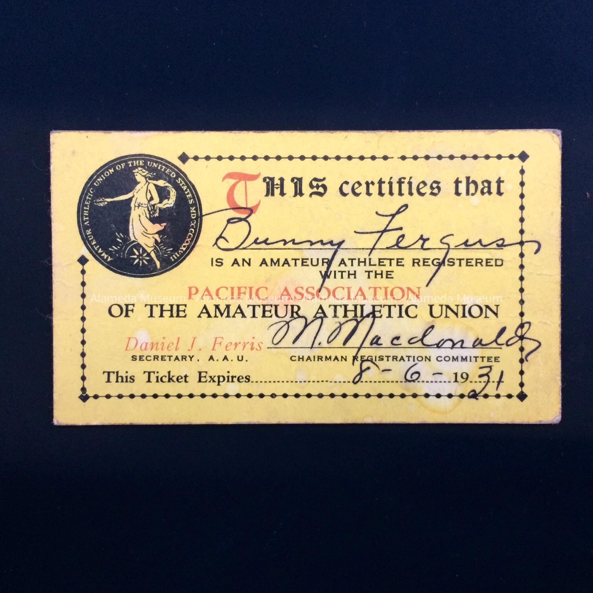 A MEMBERSHIP CARD ISSUED TO BUNNY FERGUS, AN AMATEUR ATHLETE. REGISTERED WITH THE PACIFIC ASSOCIATION OF THE AMATEUR ATHLETIC UNION, 1931.