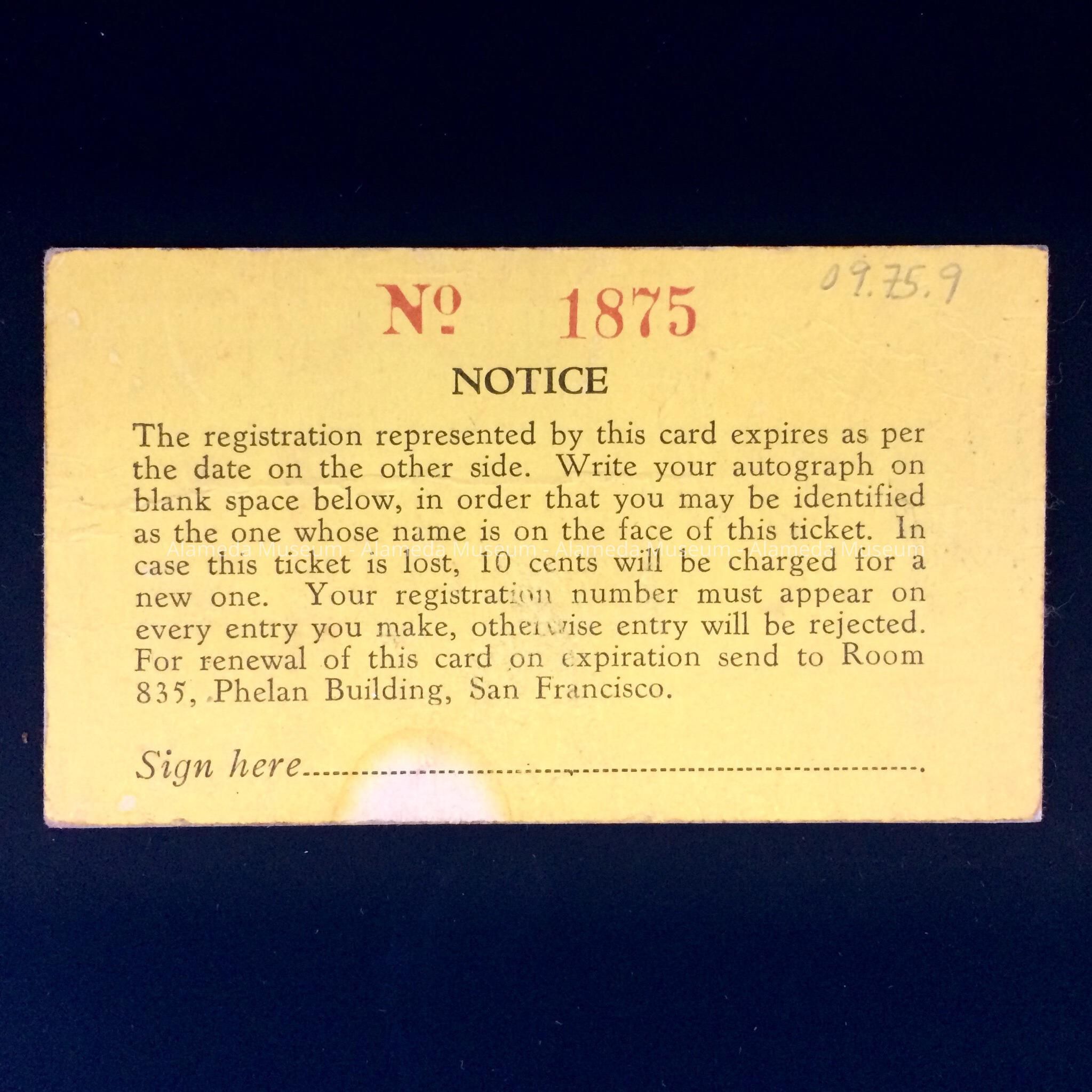 AN ORANGE-COLORED CARD, PRINTED ON HEAVY STOCK PAPER. INFORMATION BLANKS FILLED OUT BY HAND IN INK.