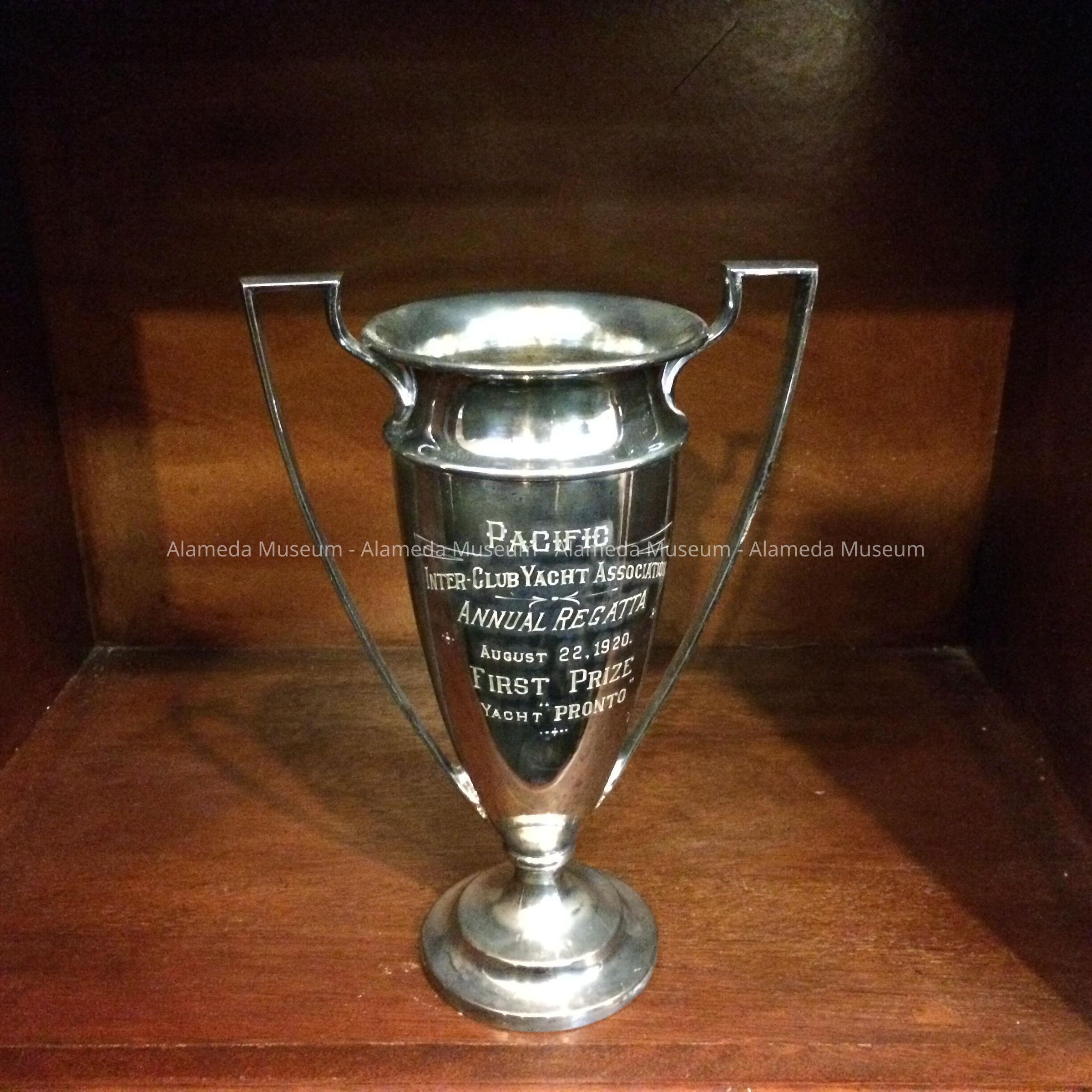 History of Object: The trophy inscription reads, "Pacific Inter-club Yacht Association Annual Regatta, Aug. 22, 1920. First Prize Yacht Pronto".