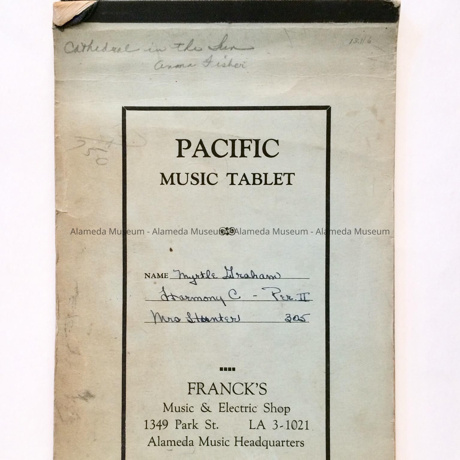 HISTORY OF OBJECT: A TABLET FOR RECORDING MUSICAL COMPOSITIONS, PURCHASED FROM FRANCK'S MUSIC STORE, 1345 PARK STREET, ALAMEDA.