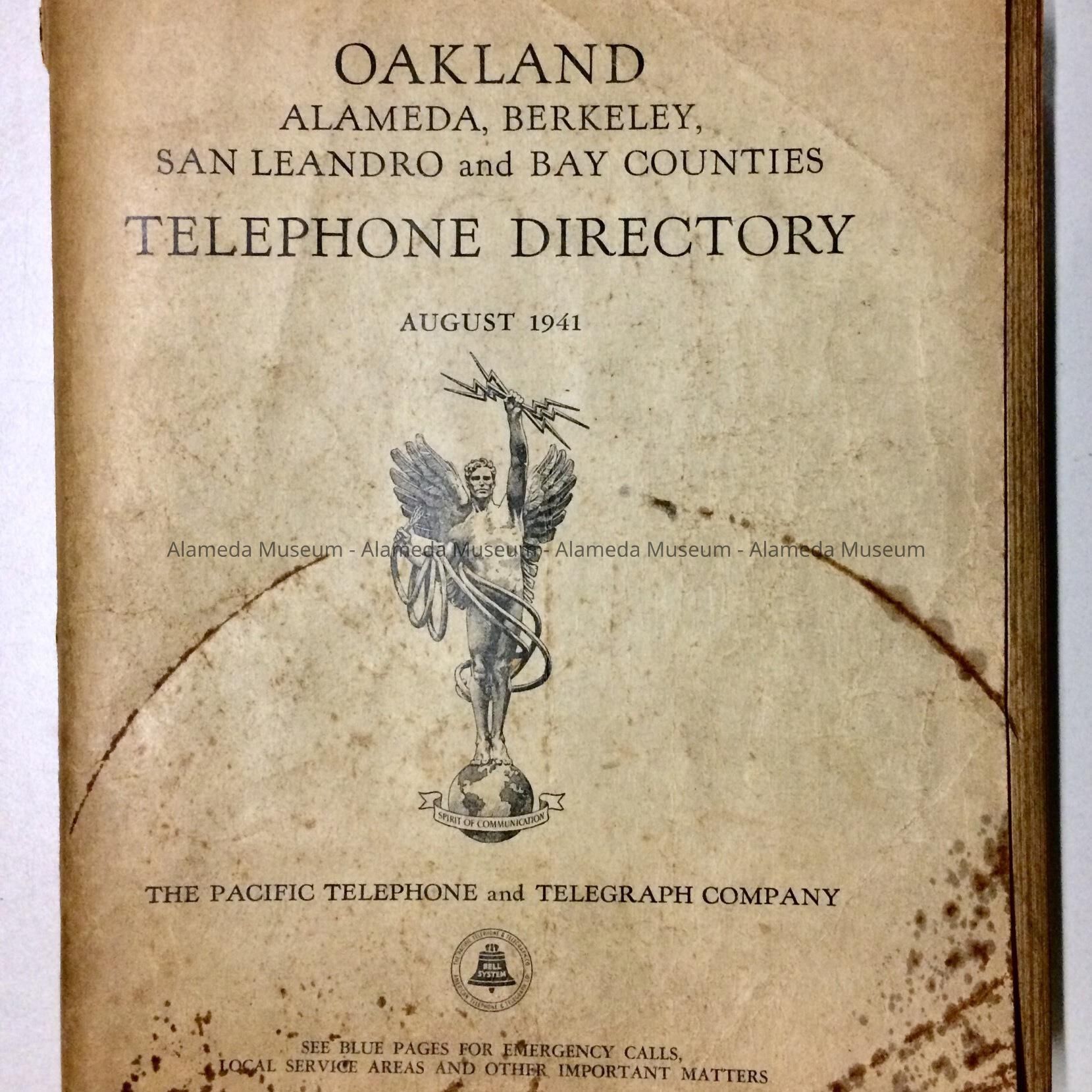 HISTORY OF OBJECT: A TELEPHONE DIRECTORY ISSUED BY THE PACIFIC TELEPHONE AND TELEGRAPH COMPANY, AUGUST 1941. THE DIRECTORY LISTS TELEPHONE NUMBERS OF RESIDENTS OF ALAMEDA, OAKLAND, BERKELEY, SAN LEANDRO, AND ADJOINING CITIES.