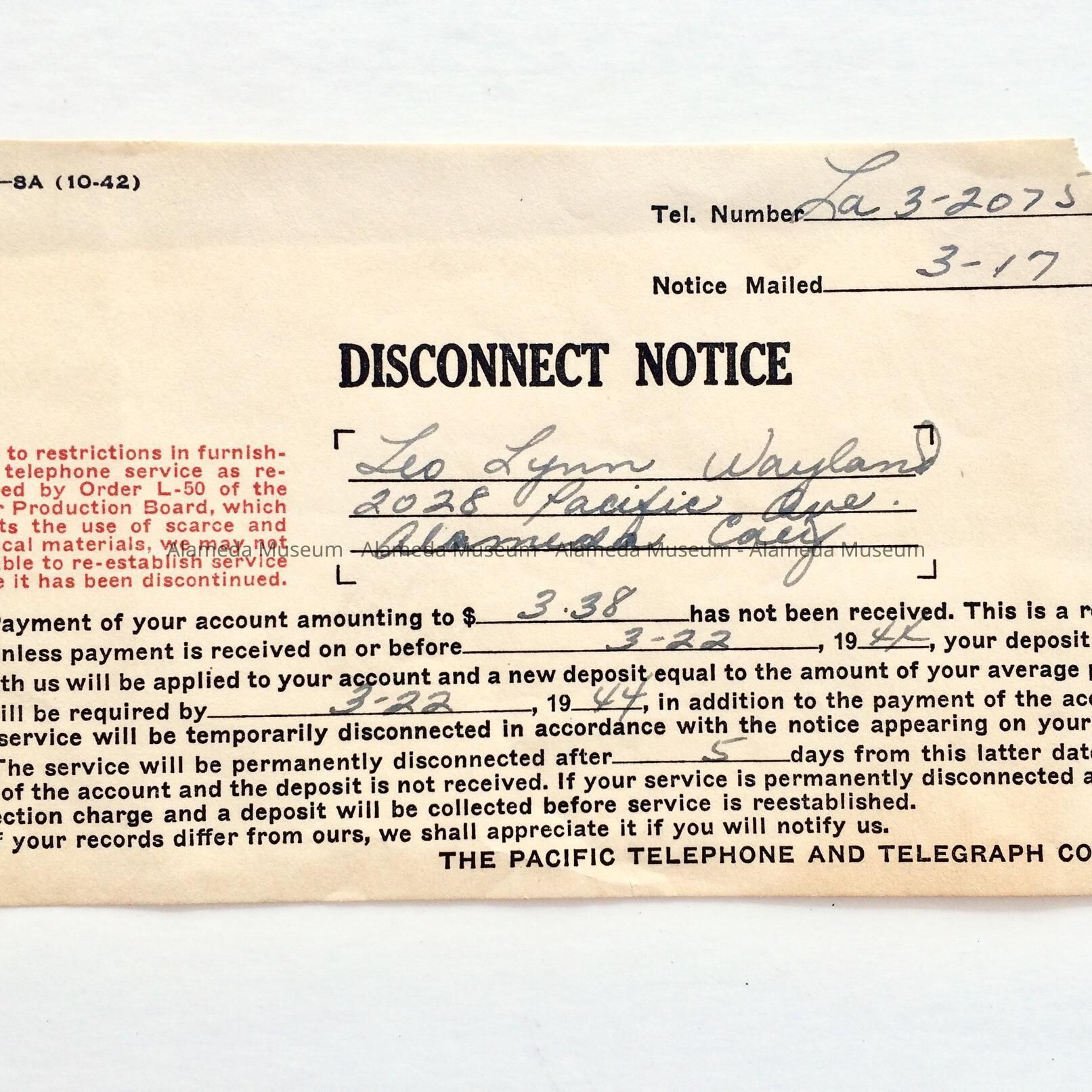 Description: Form, type K 244-8A (10-42), printed in black and red type and hand-written information on lines intended for this purpose, with caption 'Disconnect Notice', and, within an area indicated with for corners, the handwritten address of Leo Lynn Wayland, 2028 Pacific Ave.