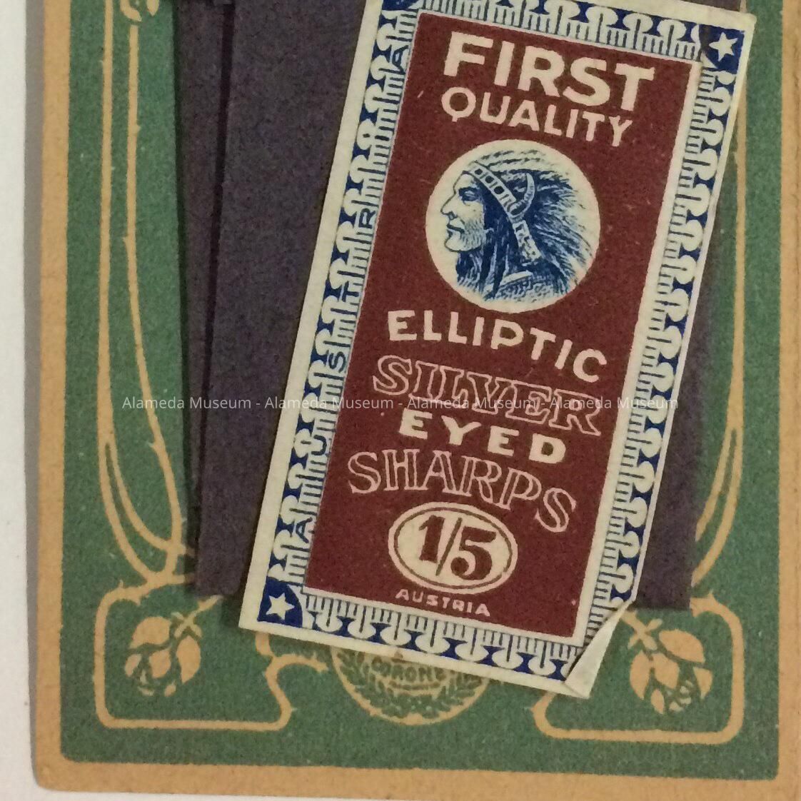 HISTORY OF OBJECT: PACKET CONTAINING SEWING NEEDLES THAT BELONGED TO THE LATE ADELINE TOY COX, WIFE OF WILLIAM COX, WHO WAS A MEMBER OF AN ALAMEDA PIONEER FAMILY.