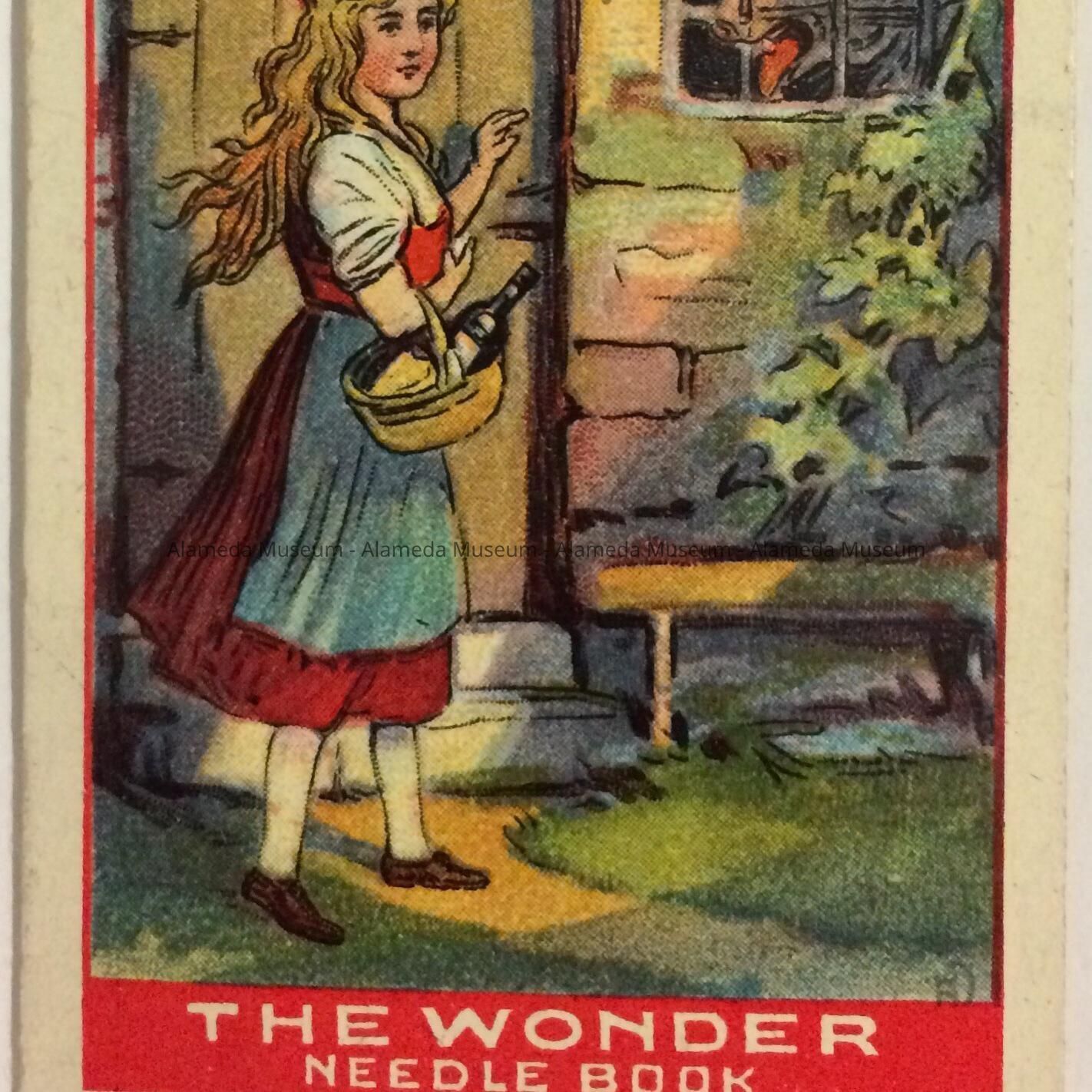 DESCRIPTION: PACKAGE OF SEWING NEEDLES ATTACHED TO A LITHOGRAPHIC CARD. CARD HAS AN ILLUSTRATION DEPICTING LITTLE RED RIDING HOOD AT GRANDMA'S HOUSE. CAPTION READS, "THE WONDER NEEDLE BOOK."