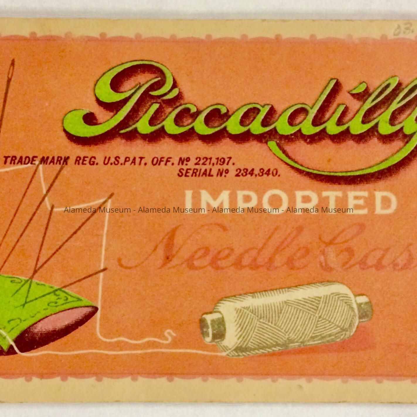 DESCRIPTION: INDIVIDUAL NEEDLE PACKAGES ATTACHED TO HEAVY STOCK PAPER COVERLET. COVERLET HAS ILLUSTRATED COVER AND CAPTION, "PICCADILLY," IMPRINTED. NEEDLE CASE IN GREEN- BLACK AND GREEN-AND-PINK COLORED TYPE.