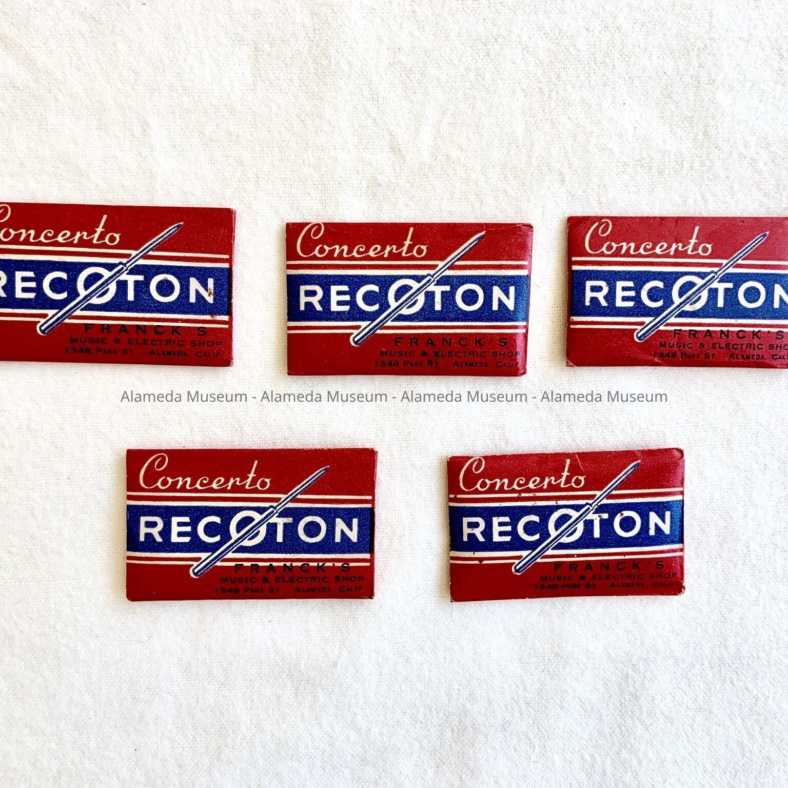Individual envelopes sealed containing record needles. Label in white, black and red colored type states "Concerto-Recoton"