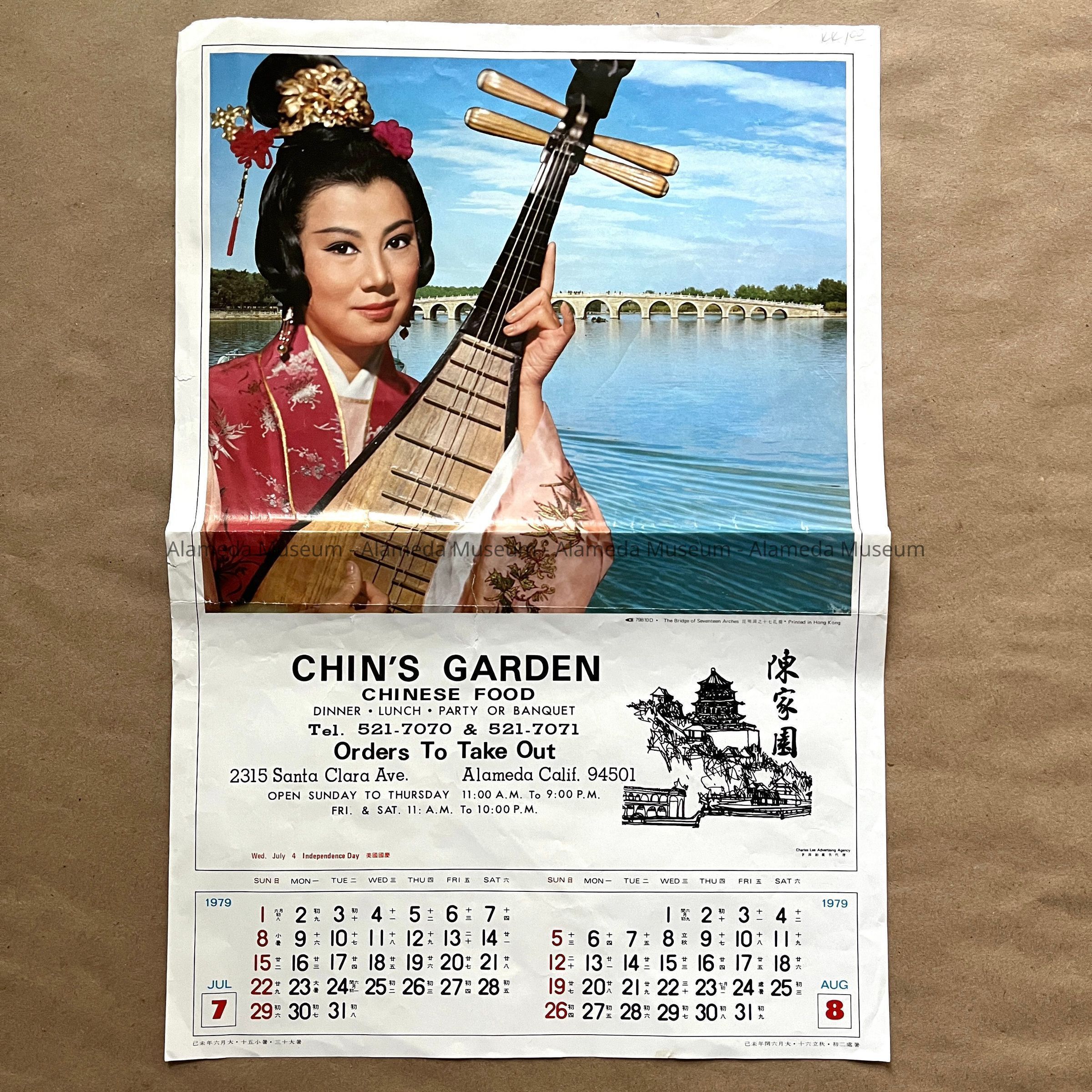 Description: page of a calendar, folded, with a photo of a woman in traditional Chinese costume and hairstyle, holding a Chinese string instrument, with in background a body of water and a bridge with many arches. The design is further decorated with a stylized drawing of Chinese style buildings. The page is for the months of July & August 1979 and appears to have been torn off - possibly with the purpose of selling each page separately. Western style numbers have Chinese characters next to them. Text printed in black type is headed with: 'CHIN'S GARDEN / CHINESE FOOD / DINNER . LUNCH . PARTY OR BANQUET' and 'Orders To Take Out'.