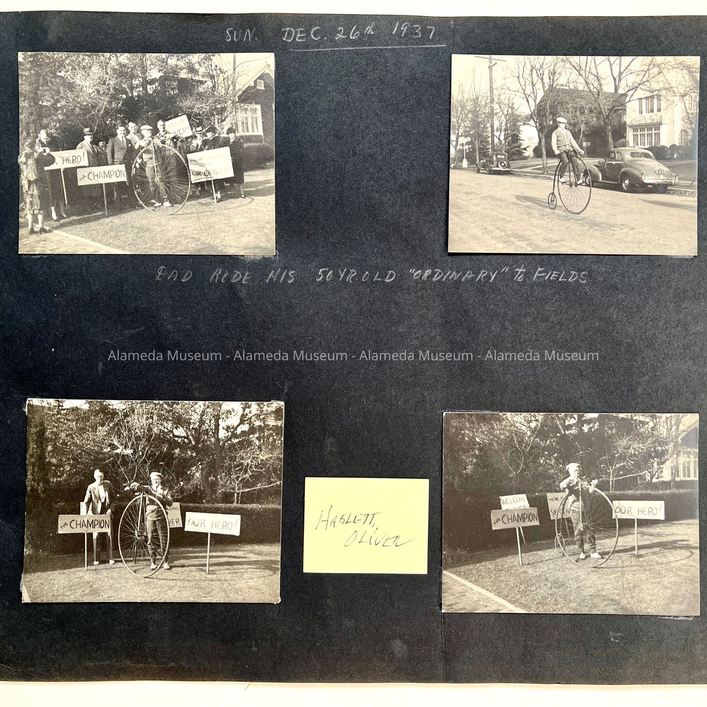 History of Object: Page removed from the Edwards family album containing 4 photos of Oliver Haslett with his "Ordinary” bicycle. The bicycle was donated to the Alameda Historical Museum by Mr. Haslett's daughter Kathleen H. Edwards.