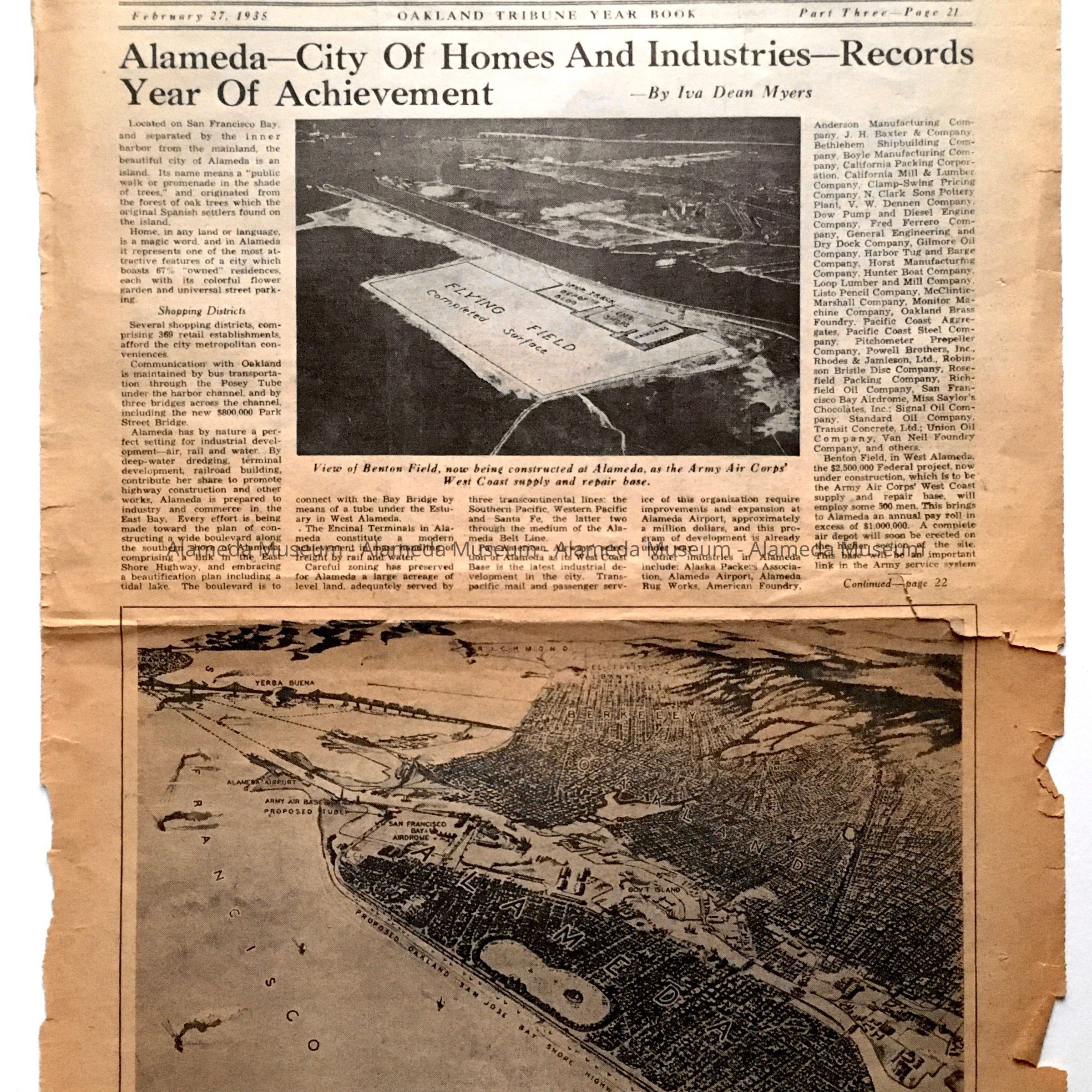 ILLUSTRATED PAGE FROM THE "OAKLAND TRIBUNE YEARBOOK," DATED FEBRUARY 27, 1935, WITH A DRAWING OF A MAP OF ALAMEDA, SHOWING A PROPOSED OAKLAND-SAN JOSE BAYSHORE HIGHWAY. ALSO INCLUDED IS A DRAWING OF BENTON FIELD, THEN BEING CONSTRUCTED. IT ALSO GIVES A LIST OF ALAMEDA INDUSTRIES DURING THAT PERIOD.