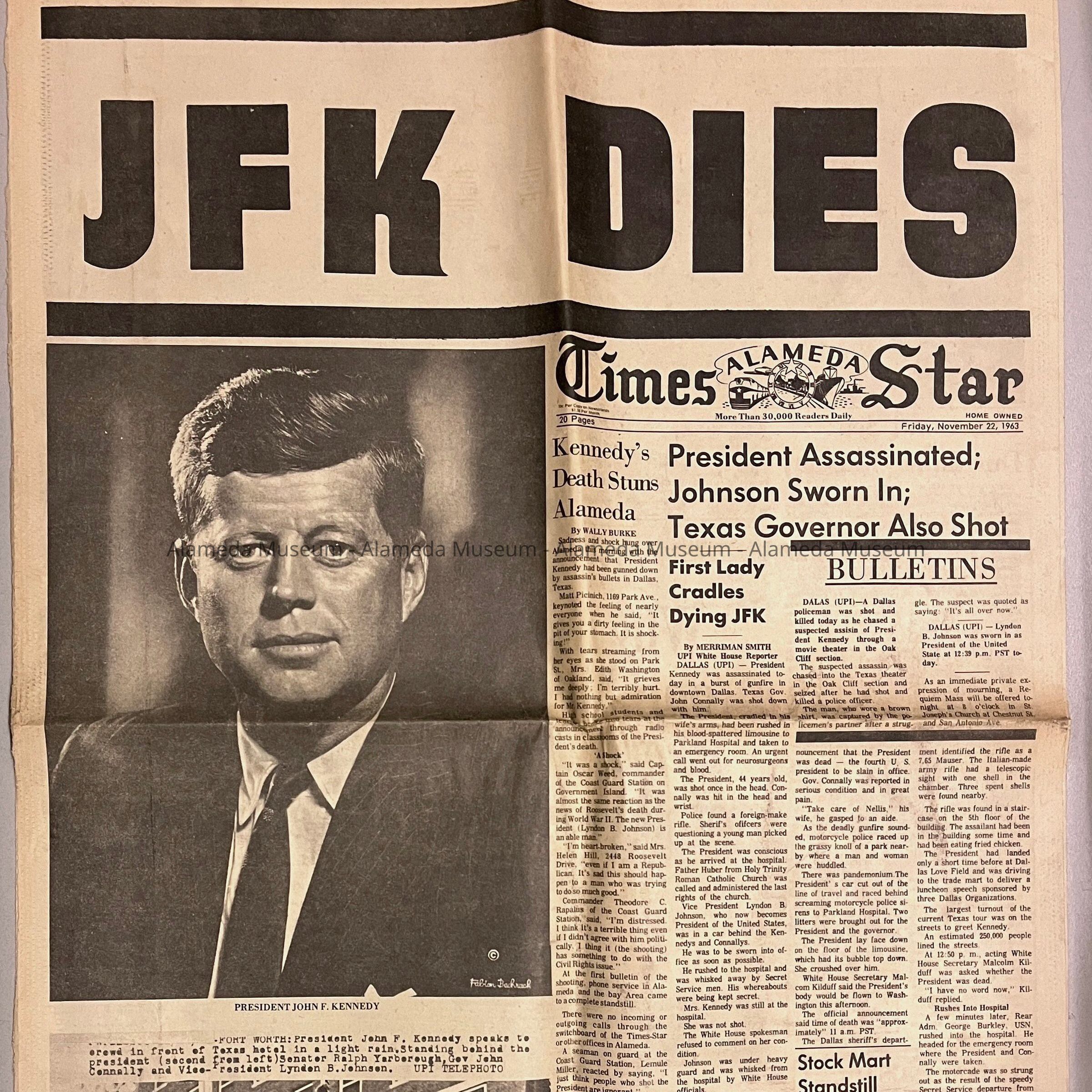 History of Object: First 4 pages of the Alameda Times-Star from November 22, 1963, reporting on the death of President John F. Kennedy. Headline of the column immediately to the right of the cover page picture reads 'Kennedy's Death Stuns Alameda', and includes reactions from residents.