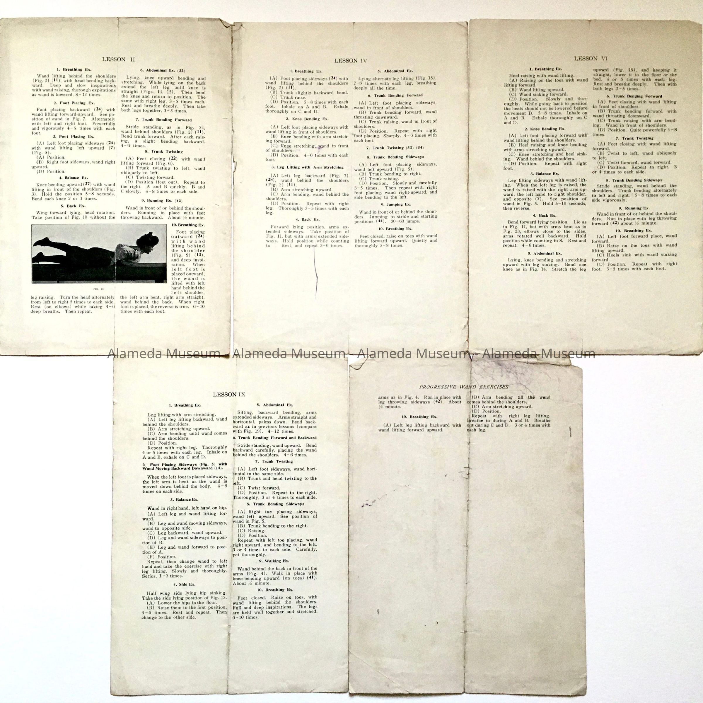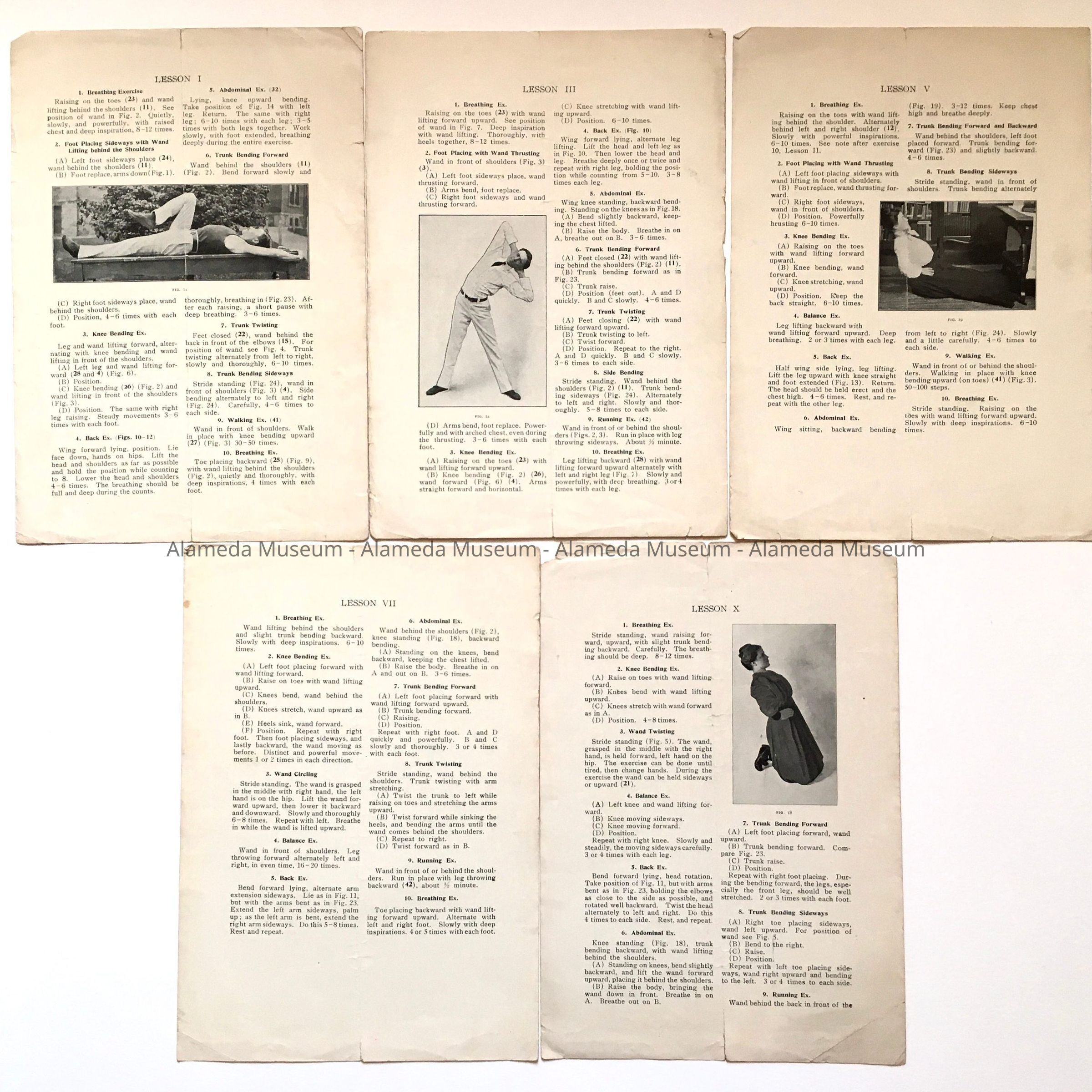 Description: 5 unnumbered pages on the subject of exercise, part of a pamphlet on that subject. The pages have become loose from each other. There are 9 lessons, I-IX, each on one side of a page, but the printer apparently accidentally skipped number VIII, and Lesson X is on two sides of a page.