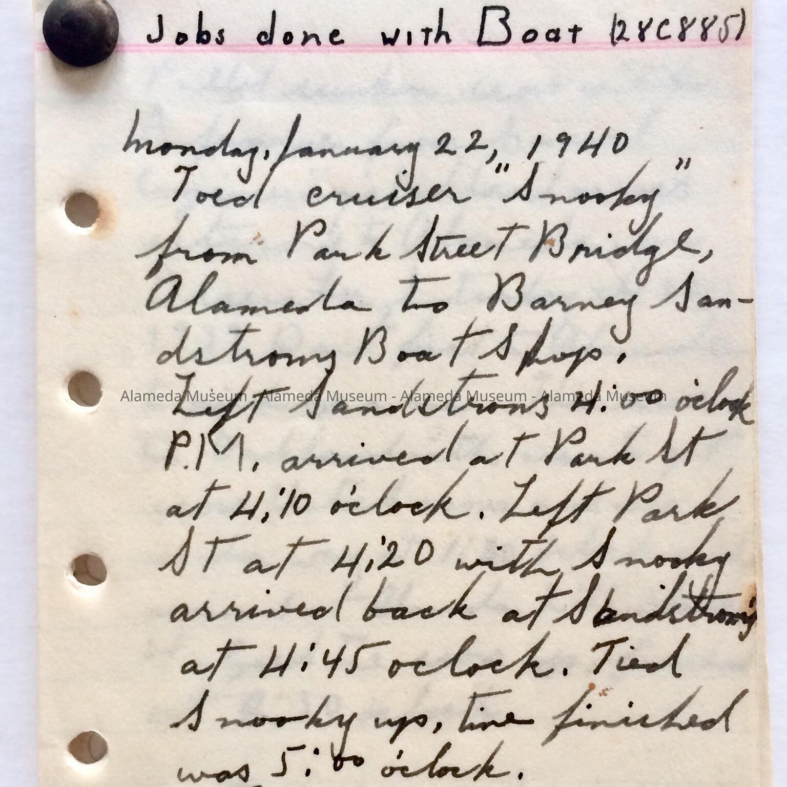 LOG COMPILED BY DOUG BURROWES, CONCERNING HAULING MATERIALS FROM ALAMEDA TO SAN FRANCISCO ON HIS BOAT. ALSO INCLUDED ARE HOURS AND COSTS. APPARENTLY MR. BURROWES WORKED AS A BOAT OPERATOR IN TRANSPORTING EQUIPMENT ACROSS SAN FRANCISCO BAY.