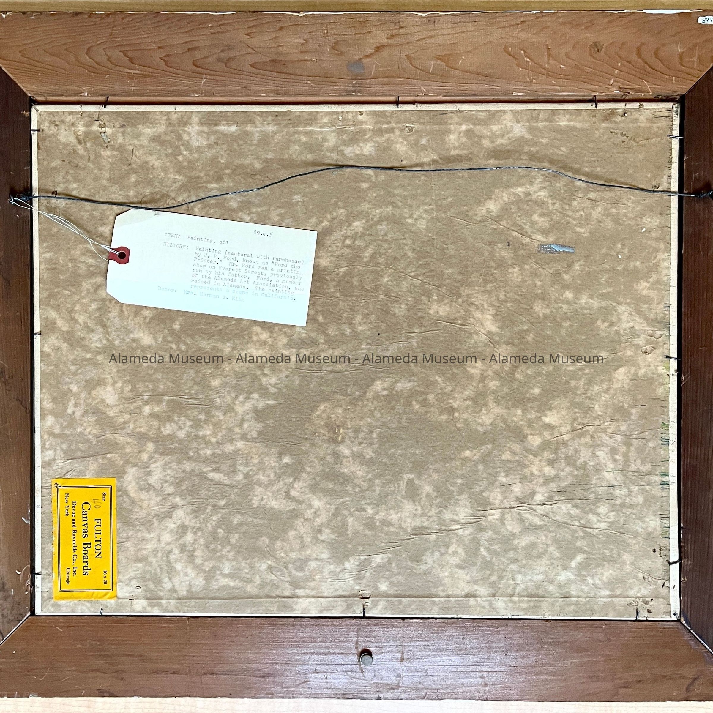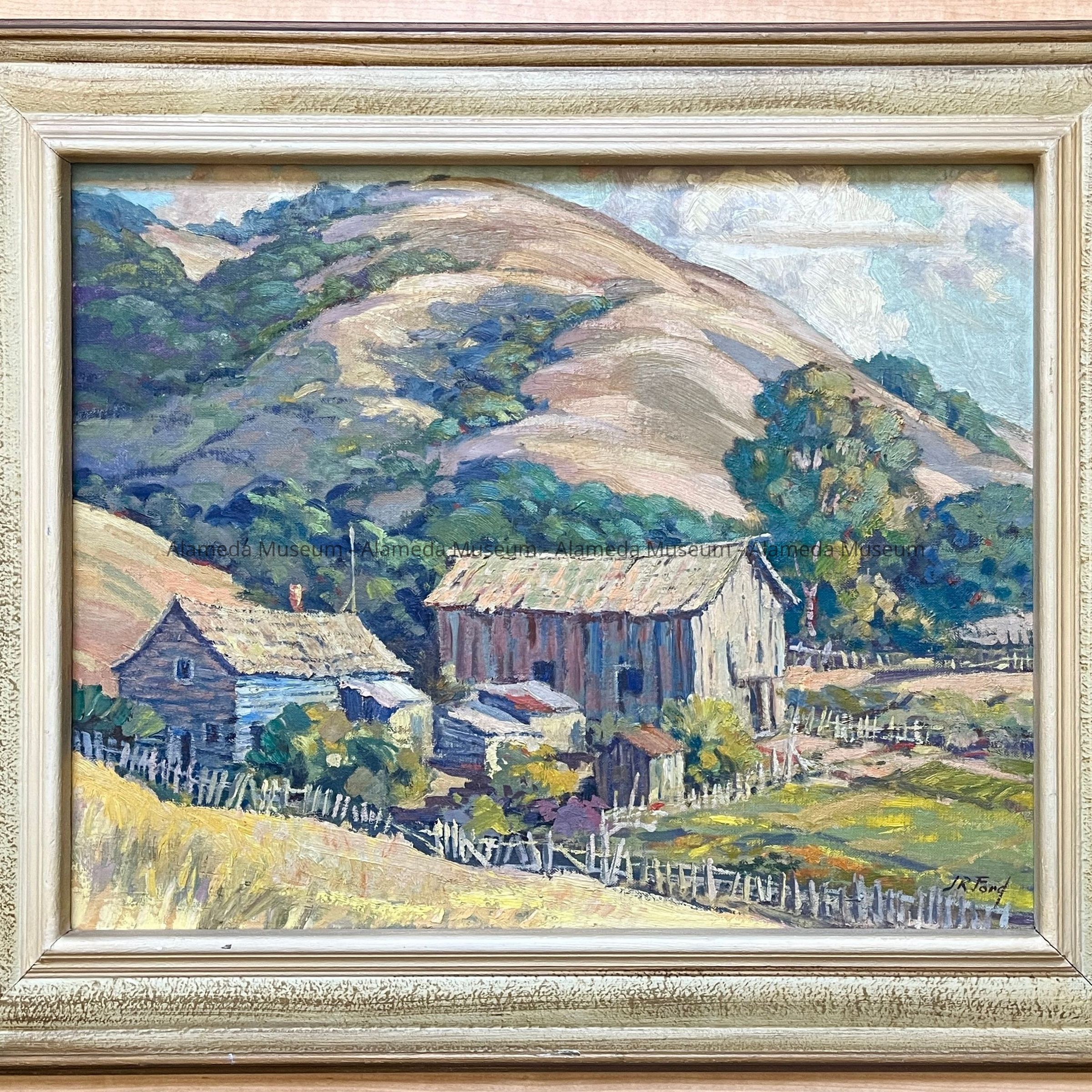 Painting by J. R. Ford, known as "Ford the Printer." Mr. Ford ran a printing shop on Everett Street, which was previously run by his father, Ford, a member of the Alameda Art Association, was raised in Alameda. The painting represents a scene in California. Possibly Niles?