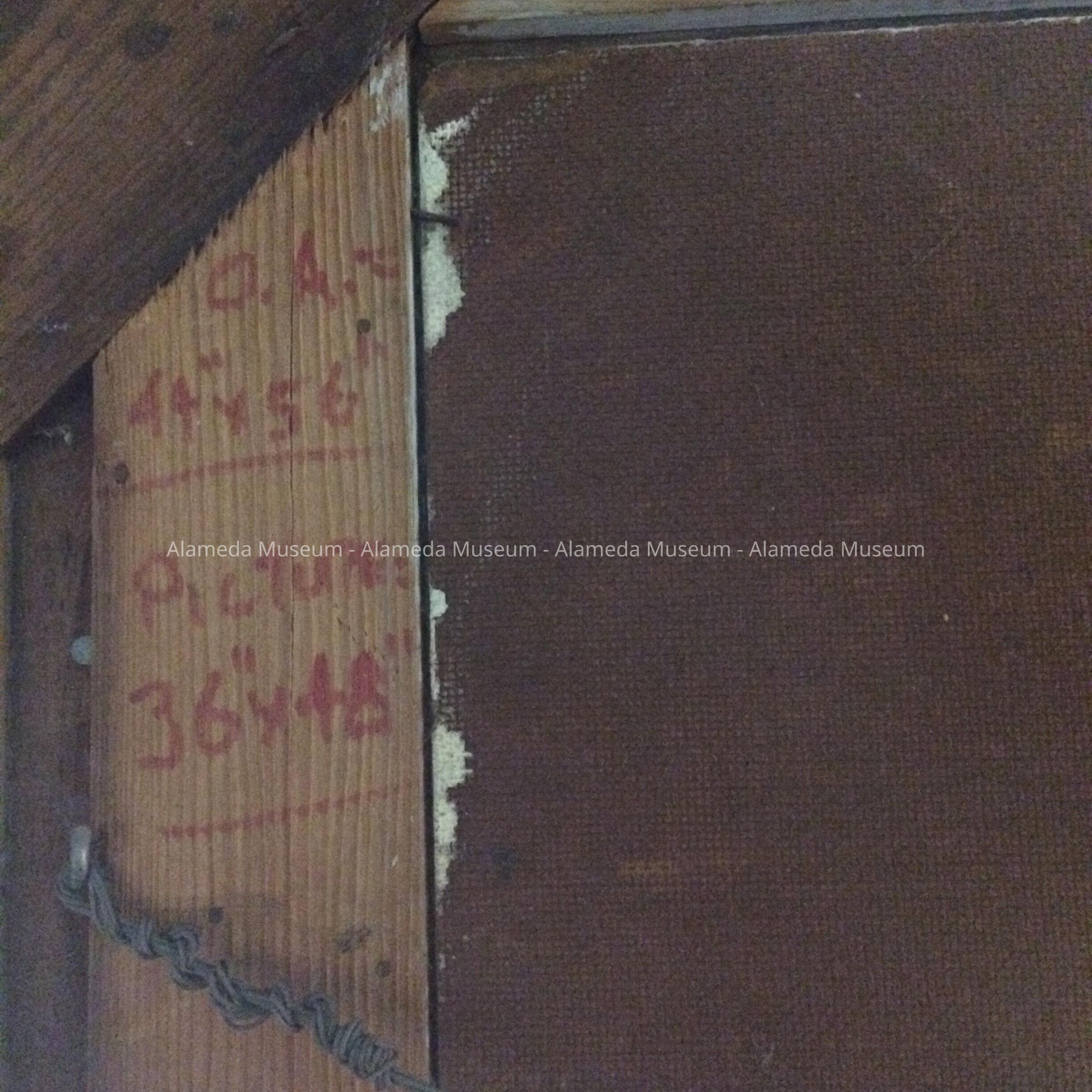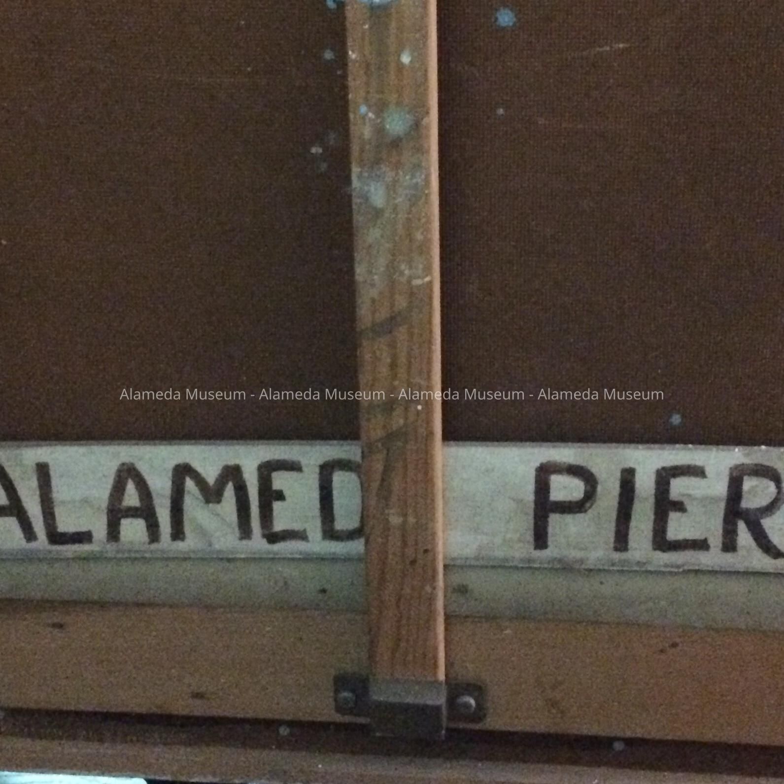 On the back, a white-painted section of a wood plank is wedged behind the middle support of the frame, on which is painted in two colors: (blue:) This was the (red:) Alameda Pier (blue:) - 1938. On the bottom edge an address sticker is placed: LeRoy F. Nelson, 4171 Berdina Road, Castro Valley, Calif 94546. On the left edge of the frame dimensions are written in red: 'O.A.: 44"x56"