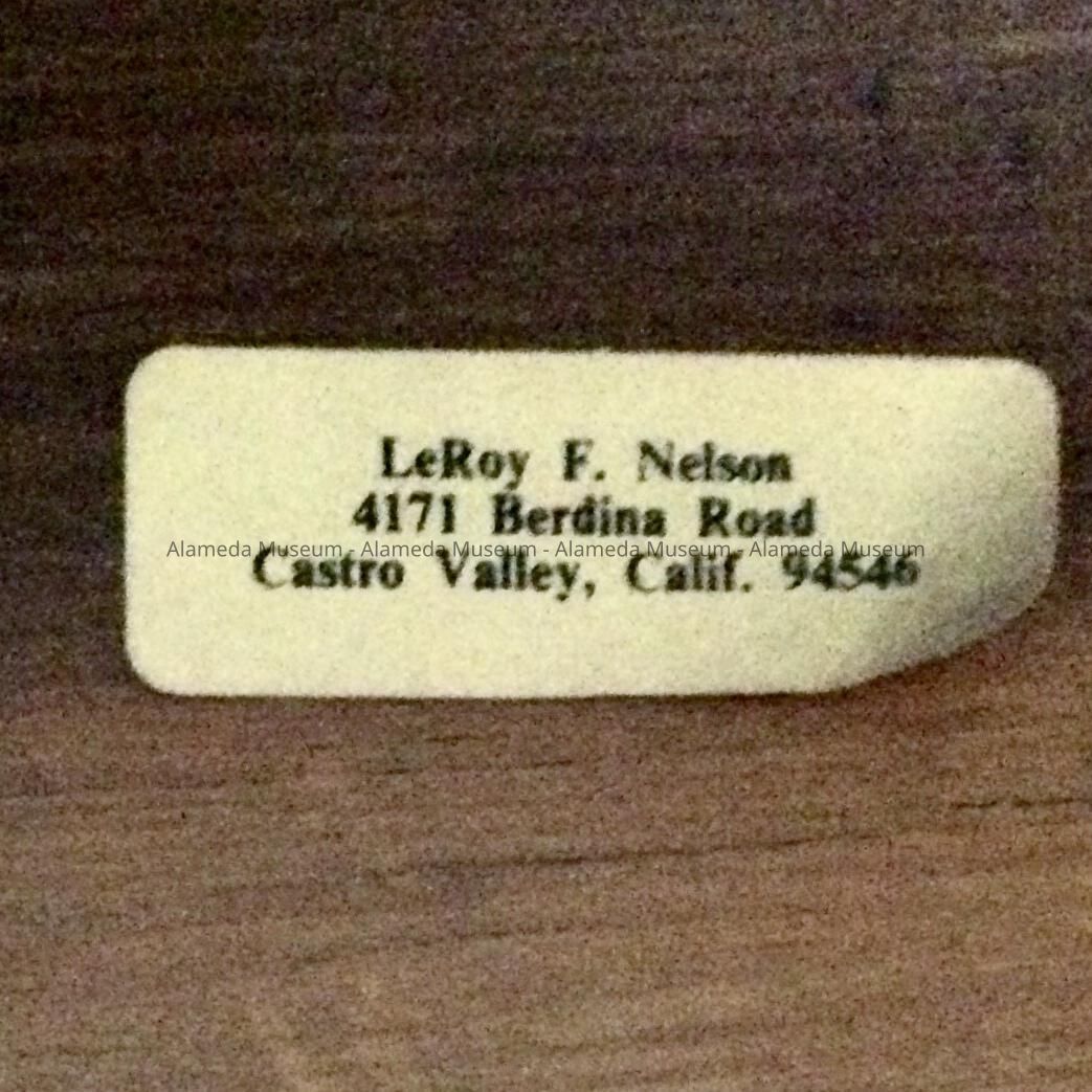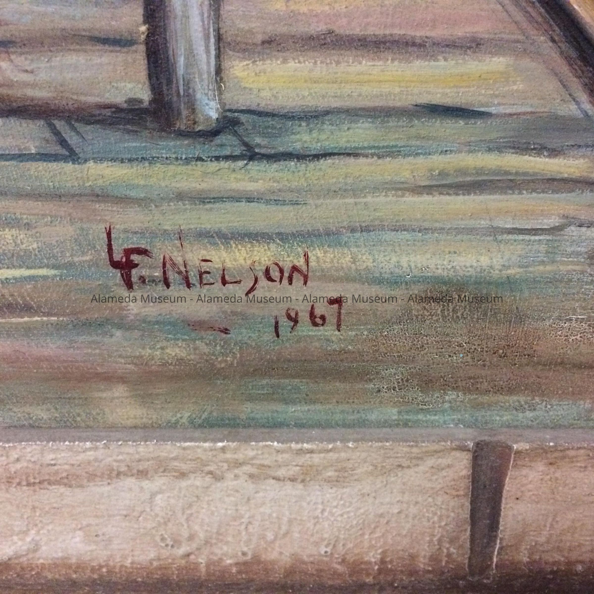 Painting after a 1938 photo, by artist Leroy Fulton Nelson (1915-2002). The family moved to Alameda from San Francisco between 1920 and 1930 and LeRoy graduated from Alameda High in 1933, and by 1940 he had married Anna. They later moved to Castro Valley. His paying job was electrician, but he was also a member of the Alameda and San Leandro Art Association, as well as of the Alameda Museum.