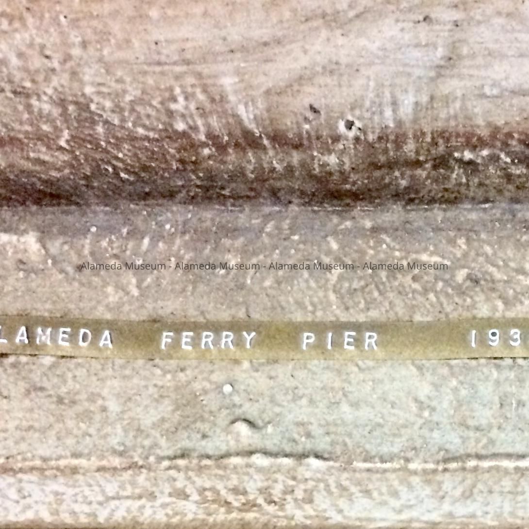The frame appears to be wood with a tan gesso finish, in which darker straight lines are added in the corners, giving a burn or rubbed look. On the frame is a raised-typed strip label stating (in all caps white raised lettering) 'Alameda Ferry Pier 1938'.