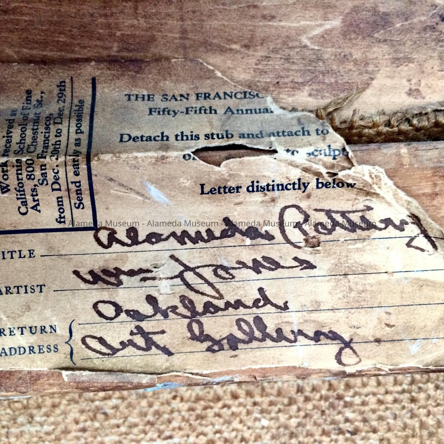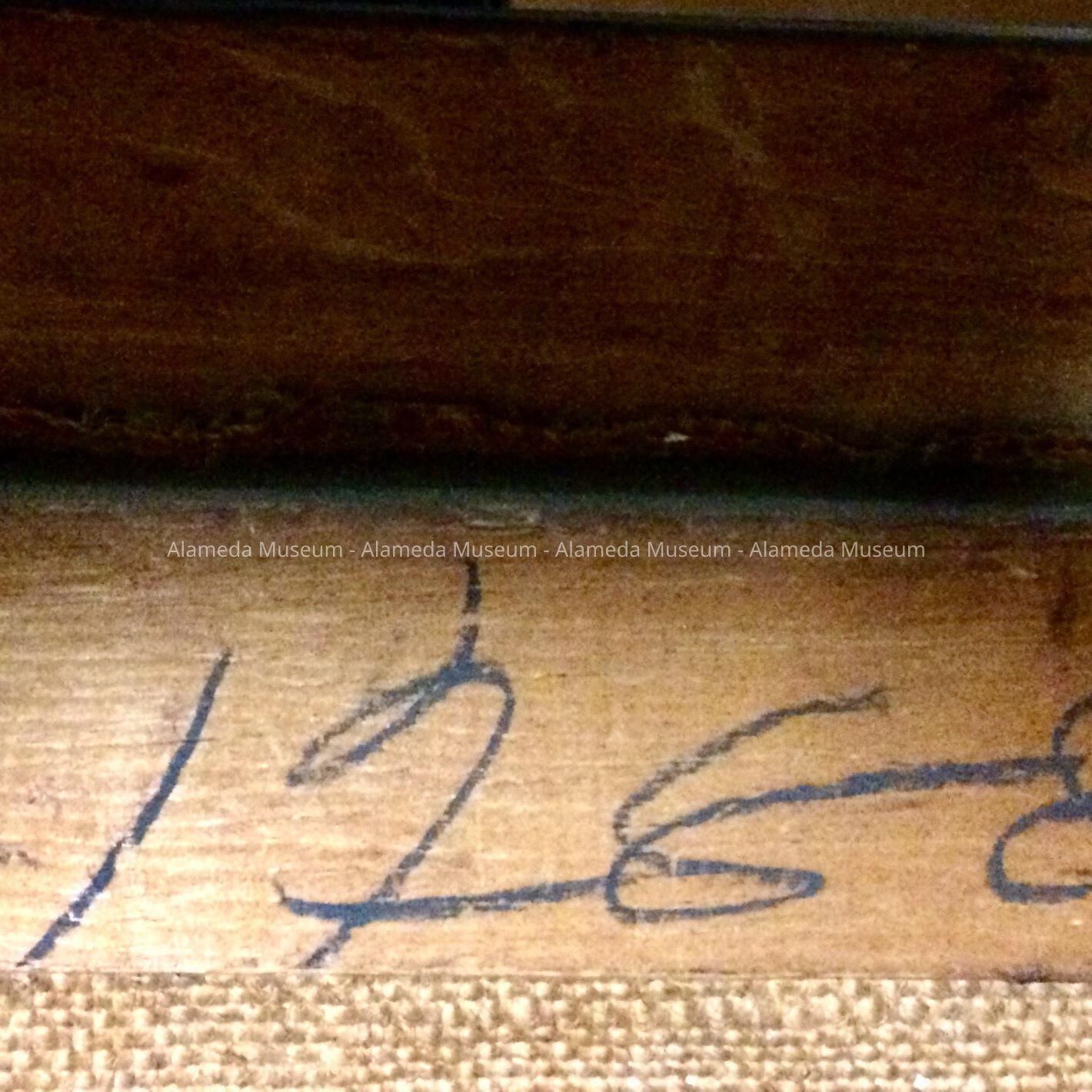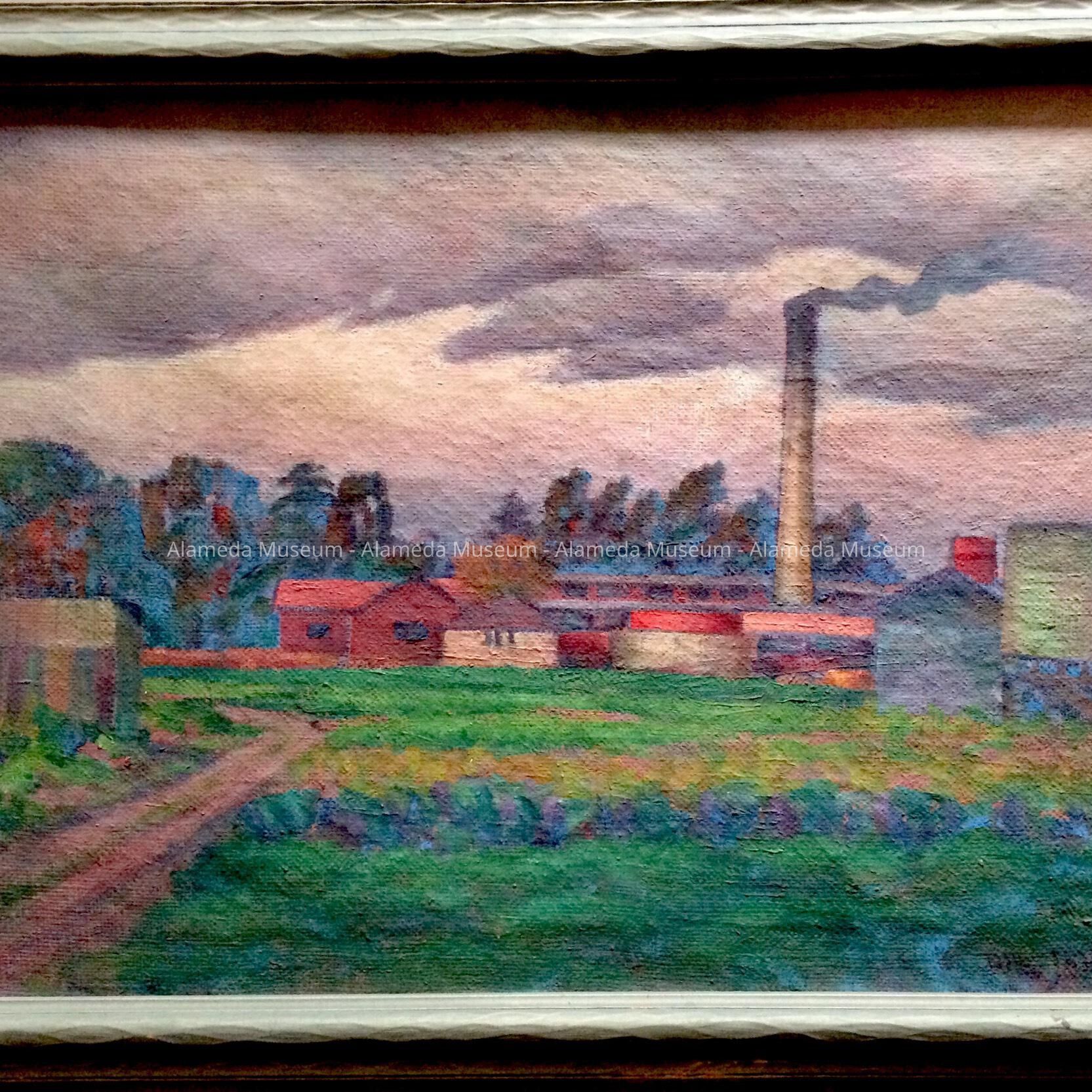 Description: Oil painting on canvas, of a dirt track, and beyond fields of what appears to be cabbages or kale, a factory with a tall smoking chimney, brick red and other buildings. Signed bottom right, in purple, Wm. - or Will? - Jones. A label on the back states: Title: Alameda Pottery; Artist: Wm Jones; Return Address: Oakland Art Gallery.