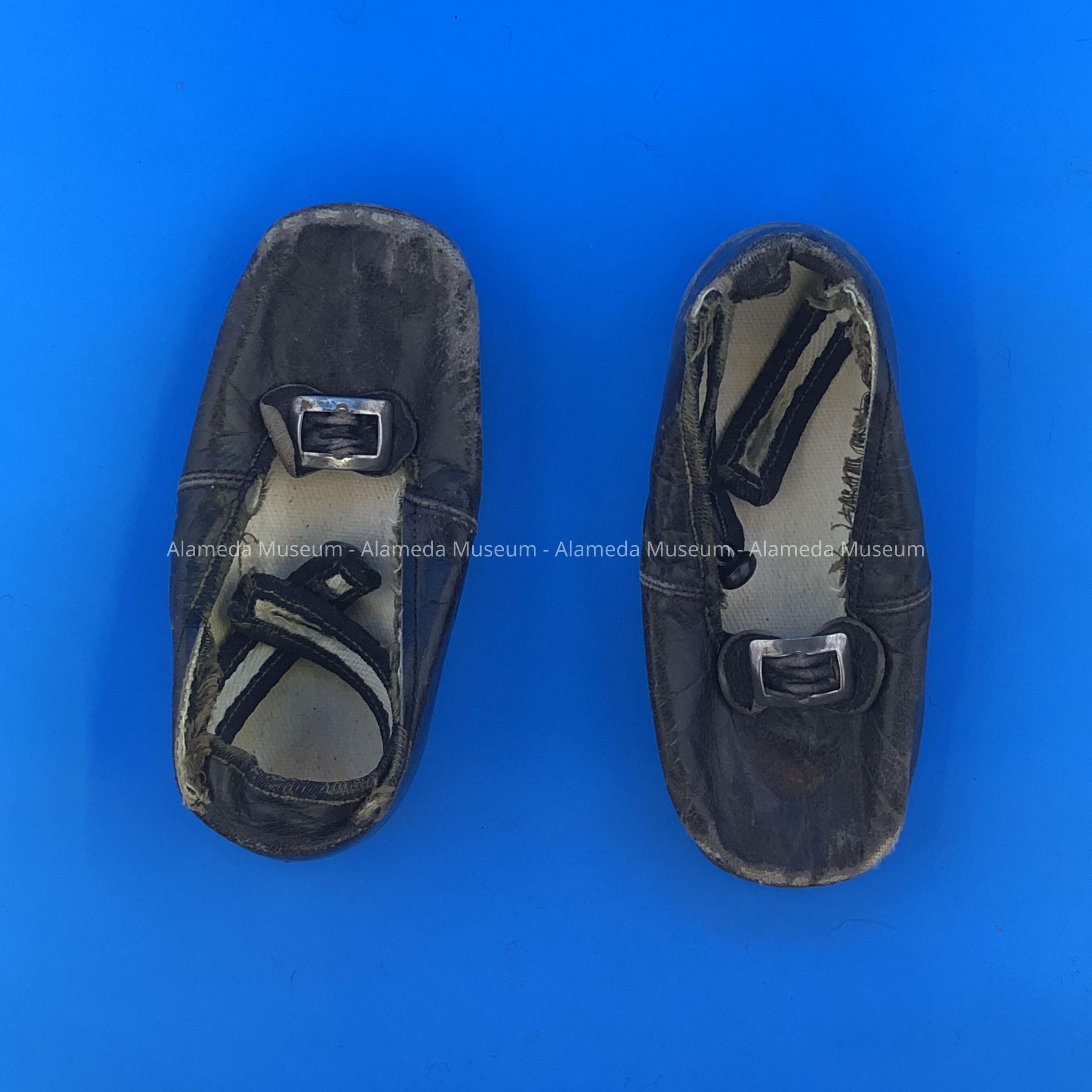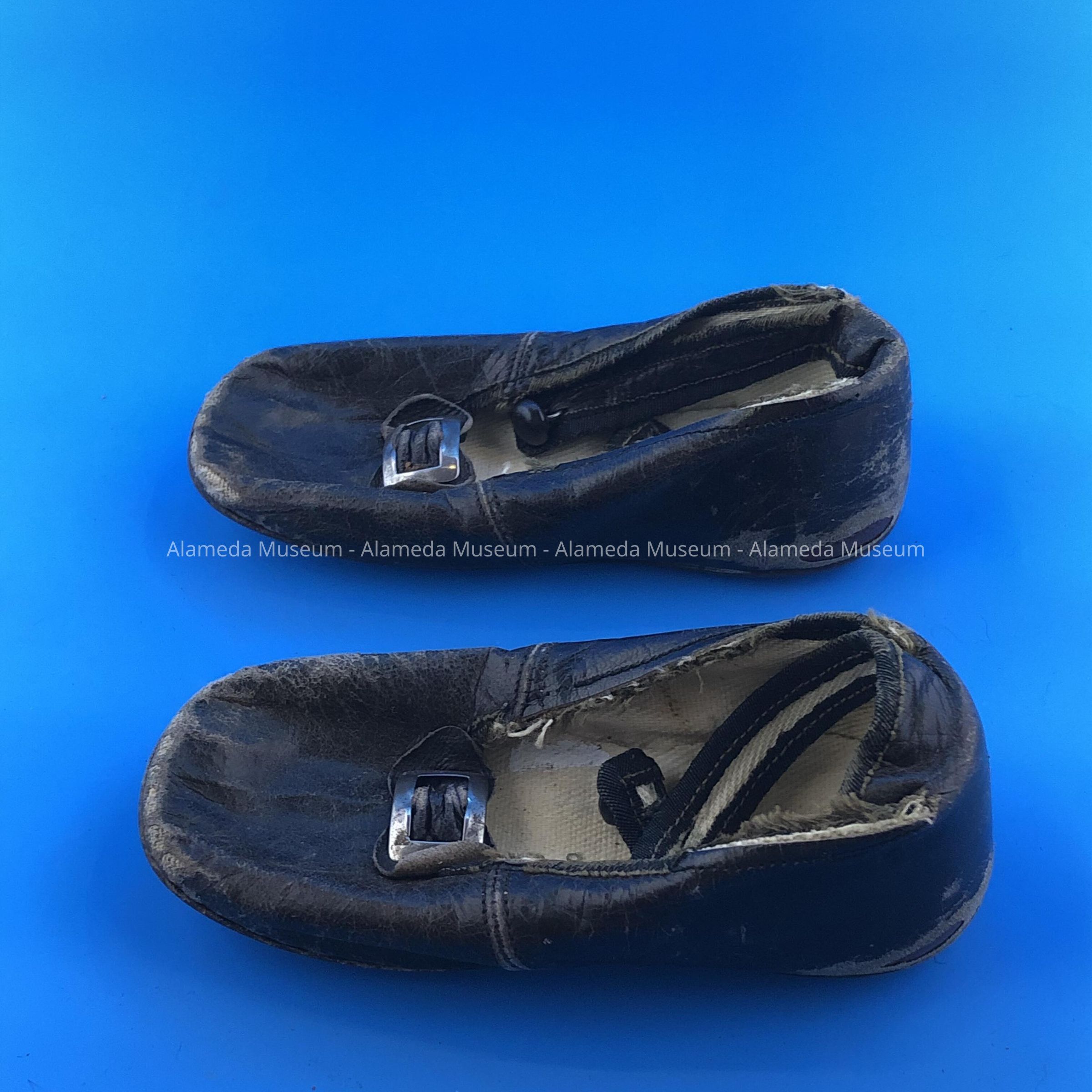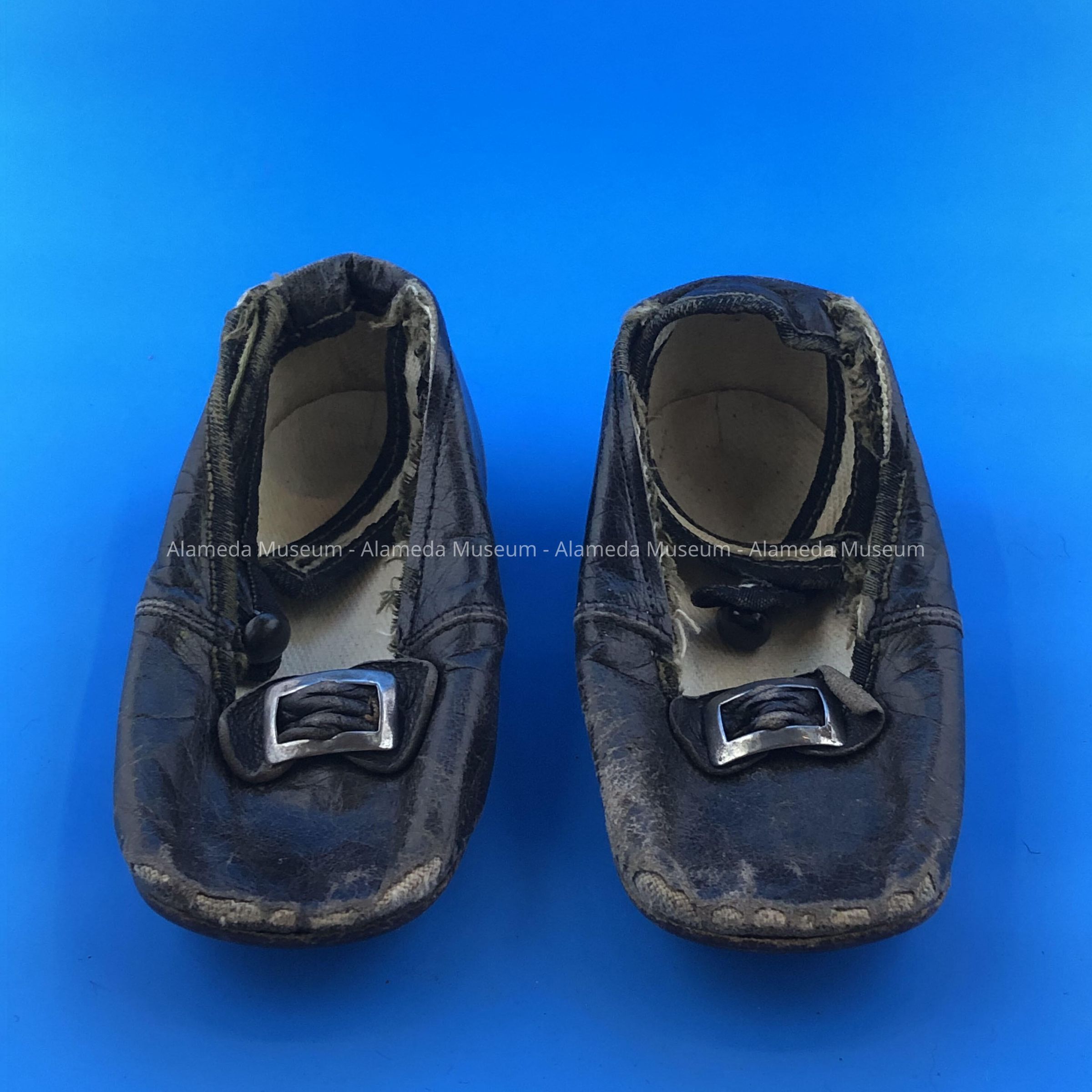 Description: Black leather infant’s shoes with nickel plated buckles. Manufacturer unknown.